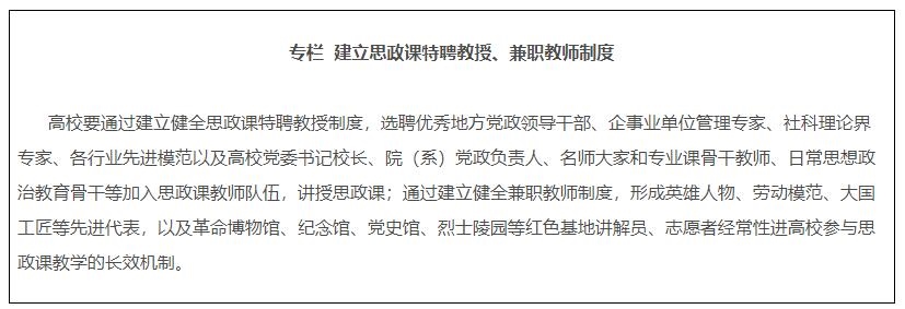 14.建設(shè)專兼結(jié)合的師資隊伍。各地各校嚴(yán)格按照要求配備建強(qiáng)高校專職思政課教師、輔導(dǎo)員隊伍,提高中小學(xué)專職思政課教師比例,實行思政課特聘教授、兼職教師制度,積極聘請黨政領(lǐng)導(dǎo)、科學(xué)家、老同志、先進(jìn)模范等擔(dān)任思政課兼職教師。深入實施馬克思主義學(xué)院院長(書記)培養(yǎng)工程,通過集中培養(yǎng)培訓(xùn)、委托重大項目、加強(qiáng)實踐鍛煉、開展國際國內(nèi)訪學(xué)等方式,培養(yǎng)一批青年馬克思主義理論家。