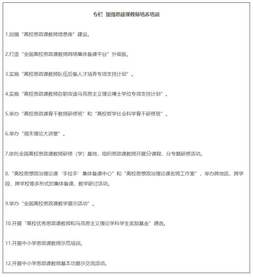 19.全面推進(jìn)課程思政高質(zhì)量建設(shè)。教育部組建高等學(xué)校課程思政教學(xué)指導(dǎo)委員會,研制普通本科專業(yè)類課程思政教學(xué)指南,組織開展高校教師課程思政教學(xué)能力培訓(xùn),建設(shè)一批課程思政系列共享資源庫。建成一批課程思政示范高校,推出一批課程思政示范課程,選樹一批課程思政教學(xué)名師和團(tuán)隊,建設(shè)一批高校課程思政教學(xué)研究示范中心。加強(qiáng)中小學(xué)學(xué)科德育建設(shè)。