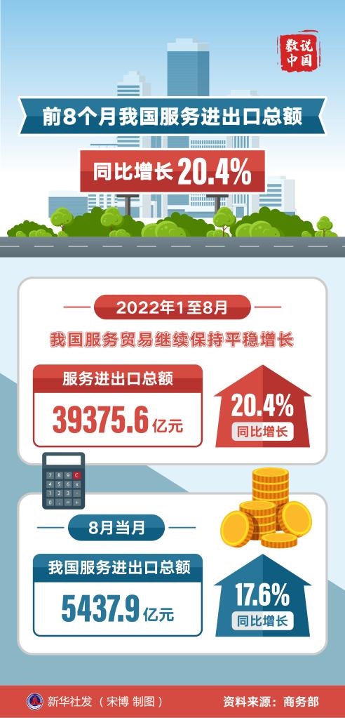 新華社北京10月12日電(記者謝?,帲┥虅詹?2日公布數(shù)據(jù)顯示,今年1至8月,我國服務貿(mào)易繼續(xù)保持平穩(wěn)增長。服務進出口總額39375.6億元,同比增長20.4%。
