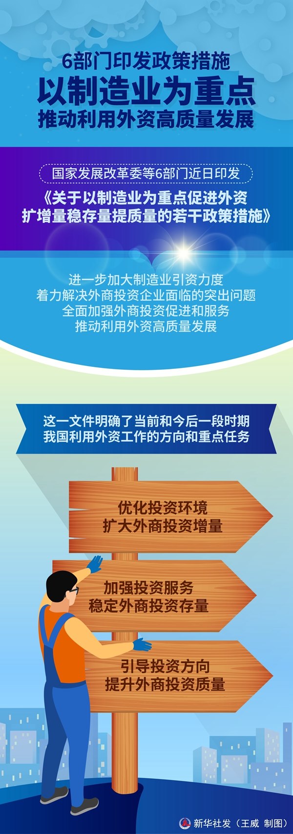 新華社北京10月25日電(記者安蓓)記者25日了解到,國家發(fā)展改革委等6部門近日印發(fā)《關(guān)于以制造業(yè)為重點(diǎn)促進(jìn)外資擴(kuò)增量穩(wěn)存量提質(zhì)量的若干政策措施》,進(jìn)一步加大制造業(yè)引資力度,著力解決外商投資企業(yè)面臨的突出問題,全面加強(qiáng)外商投資促進(jìn)和服務(wù),推動(dòng)利用外資高質(zhì)量發(fā)展。