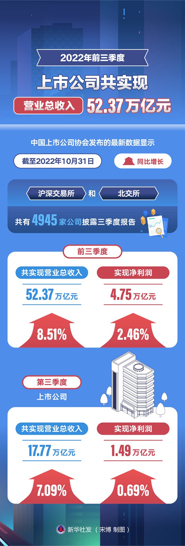 新華社北京11月1日電(記者 姚均芳)中國上市公司協(xié)會(huì)發(fā)布的最新數(shù)據(jù)顯示,截至2022年10月31日,滬深交易所和北交所共有4945家公司披露三季度報(bào)告,前三季度共實(shí)現(xiàn)營業(yè)總收入52.37萬億元,同比增長8.51%;實(shí)現(xiàn)凈利潤4.75萬億元,同比增長2.46%。