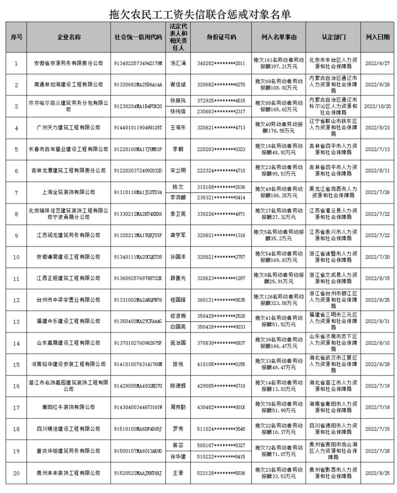 據(jù)人力資源和社會保障部公眾號,根據(jù)《拖欠農民工工資失信聯(lián)合懲戒對象名單管理暫行辦法》(人力資源和社會保障部令第45號),人力資源社會保障部現(xiàn)公布一批拖欠農民工工資失信聯(lián)合懲戒對象名單。