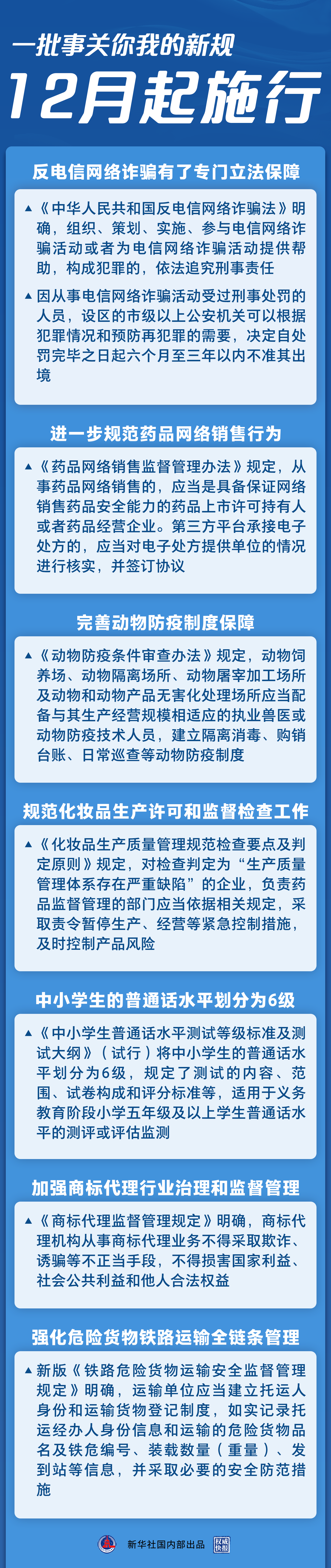 2022年的最后一個月,一批事關(guān)你我的新規(guī)開始施行。反電信網(wǎng)絡(luò)詐騙有了專門立法保障,中小學(xué)生的普通話水平有了規(guī)范標(biāo)準(zhǔn),藥品網(wǎng)絡(luò)銷售平臺責(zé)任進(jìn)一步壓實……法治,為美好生活助力。