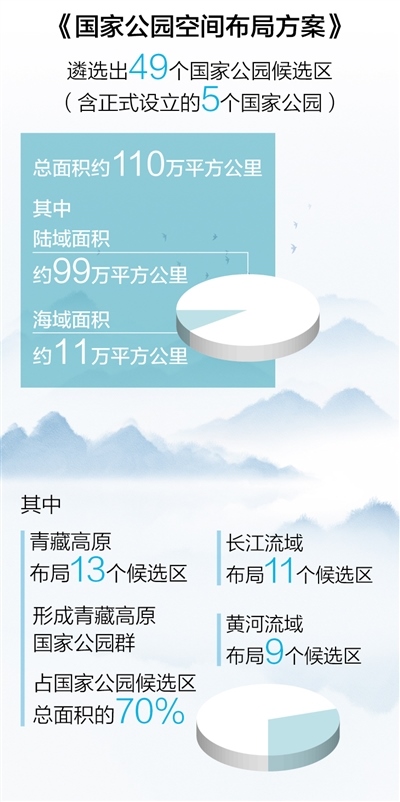 在空間布局上,遴選出49個(gè)國家公園候選區(qū)(含正式設(shè)立的5個(gè)國家公園),總面積約110萬平方公里,其中陸域面積約99萬平方公里、海域面積約11萬平方公里,占陸域國土面積的10.3%。充分銜接國家重大戰(zhàn)略和重大生態(tài)工程,其中,青藏高原布局13個(gè)候選區(qū),形成青藏高原國家公園群,占國家公園候選區(qū)總面積的70%;長(zhǎng)江流域布局11個(gè)候選區(qū),黃河流域布局9個(gè)候選區(qū)。全部建成后,中國國家公園保護(hù)面積的總規(guī)模將居世界第一。