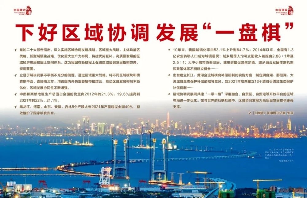 ◆ 黨的二十大報(bào)告指出,深入實(shí)施區(qū)域協(xié)調(diào)發(fā)展戰(zhàn)略、區(qū)域重大戰(zhàn)略、主體功能區(qū)戰(zhàn)略、新型城鎮(zhèn)化戰(zhàn)略,優(yōu)化重大生產(chǎn)力布局,構(gòu)建優(yōu)勢(shì)互補(bǔ)、高質(zhì)量發(fā)展的區(qū)域經(jīng)濟(jì)布局和國土空間體系。這為我國在新征程上促進(jìn)區(qū)域協(xié)調(diào)發(fā)展指明方向、擘畫藍(lán)圖。