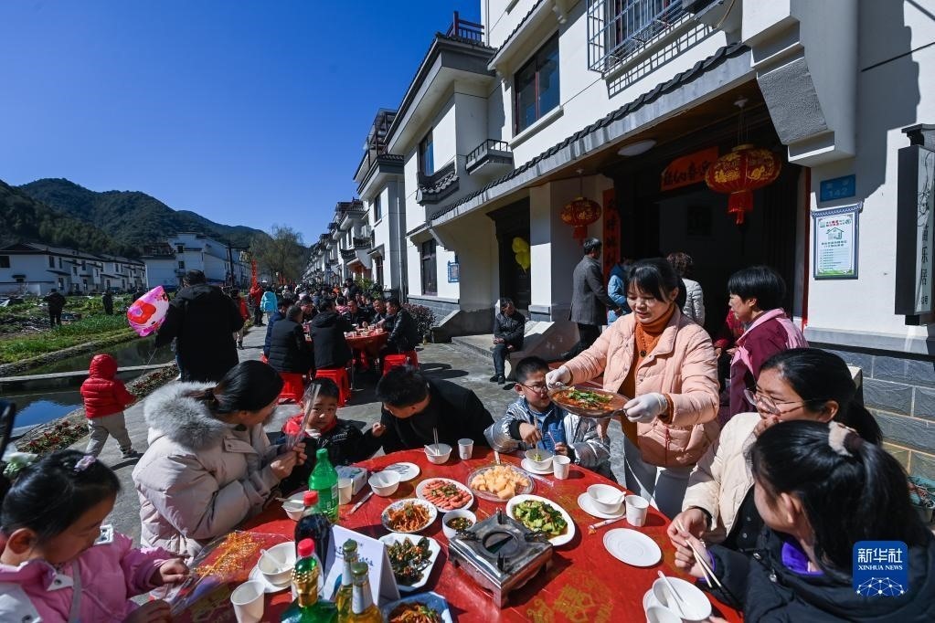 游客在浙江省建德市蓮花鎮(zhèn)戴家新村的百家宴上品嘗特色美食,感受新農(nóng)村“舌尖上的幸福”(2023年2月26日攝)。新華社記者 徐昱 攝