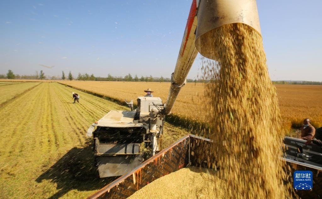 山東省臨沂市郯城縣郯城街道農(nóng)民將收獲的水稻裝車(2022年10月23日攝)。新華社發(fā)(張春雷 攝)