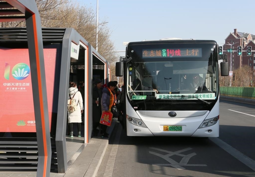 乘客在中新天津生態(tài)城的一座智慧公交站乘坐免費(fèi)的純電動公交車。