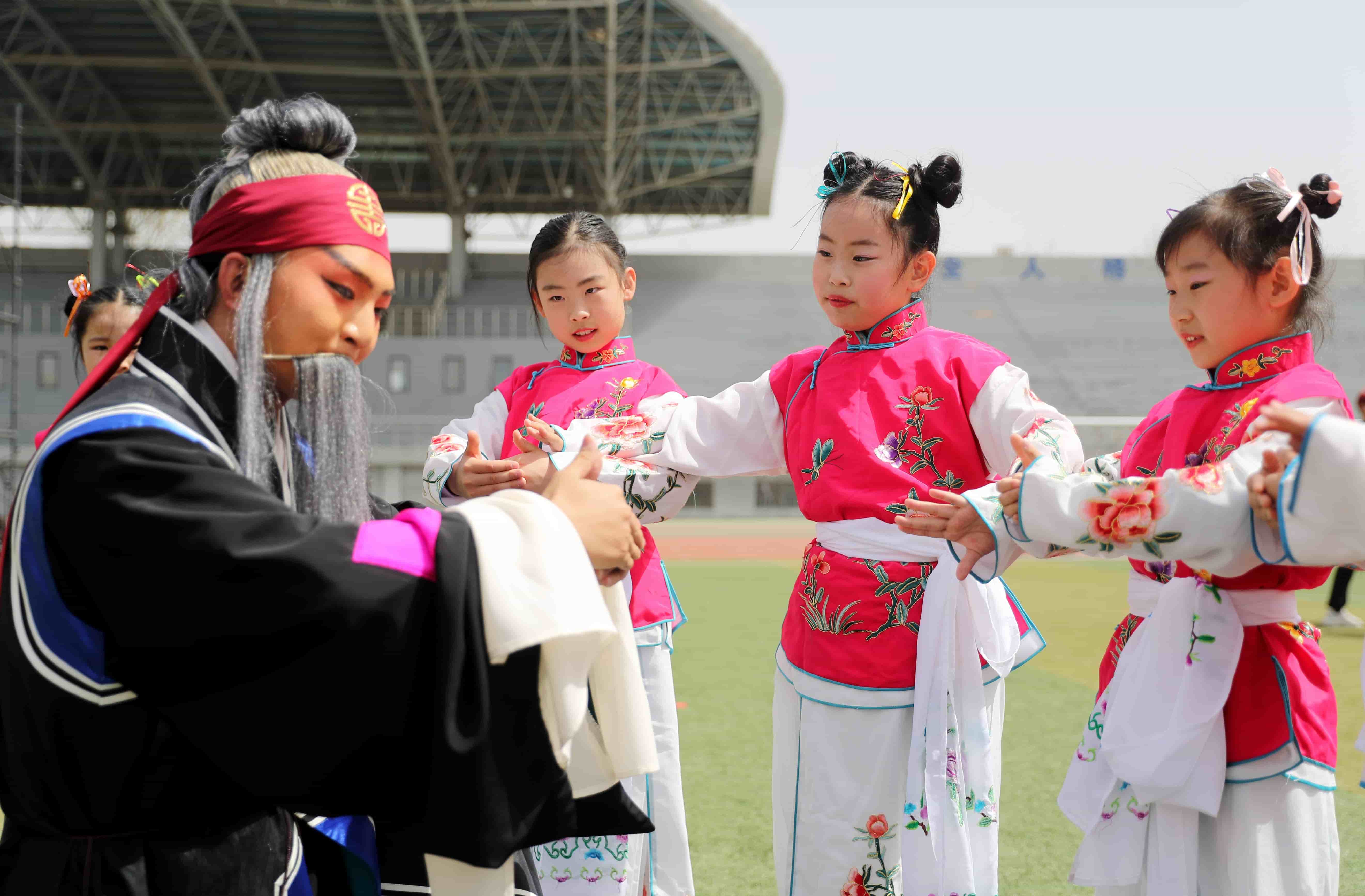 4月15日,山東青島,中國石油大學(xué)(華東)韻遠(yuǎn)京劇隊(duì)的同學(xué)們聯(lián)合青島西海岸新區(qū)珠江路小學(xué)的小學(xué)生們在大學(xué)校園里上演了一堂生動(dòng)的戲曲普及課。
