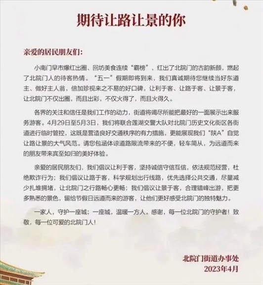 ·西安一街道辦回應(yīng)“倡議五一期間陜A讓路讓景”:想讓外地游客有更好體驗(yàn),并非強(qiáng)制播報(bào)文章。