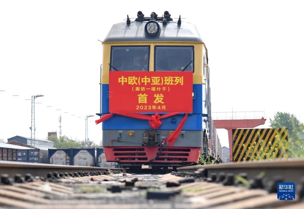 當(dāng)日,河北省廊坊市正式開通中歐(中亞)班列(廊坊——塔什干)。首列開行的集裝箱班列編組55輛,由廊坊北鐵路貨場始發(fā),經(jīng)霍爾果斯口岸出境,途經(jīng)哈薩克斯坦,最終抵達烏茲別克斯坦塔什干,全程約6000公里,預(yù)計運行時間約15天,貨物總重量1400余噸,主要包括保溫管、機械設(shè)備、型材等。新華社發(fā)(劉向攝)
