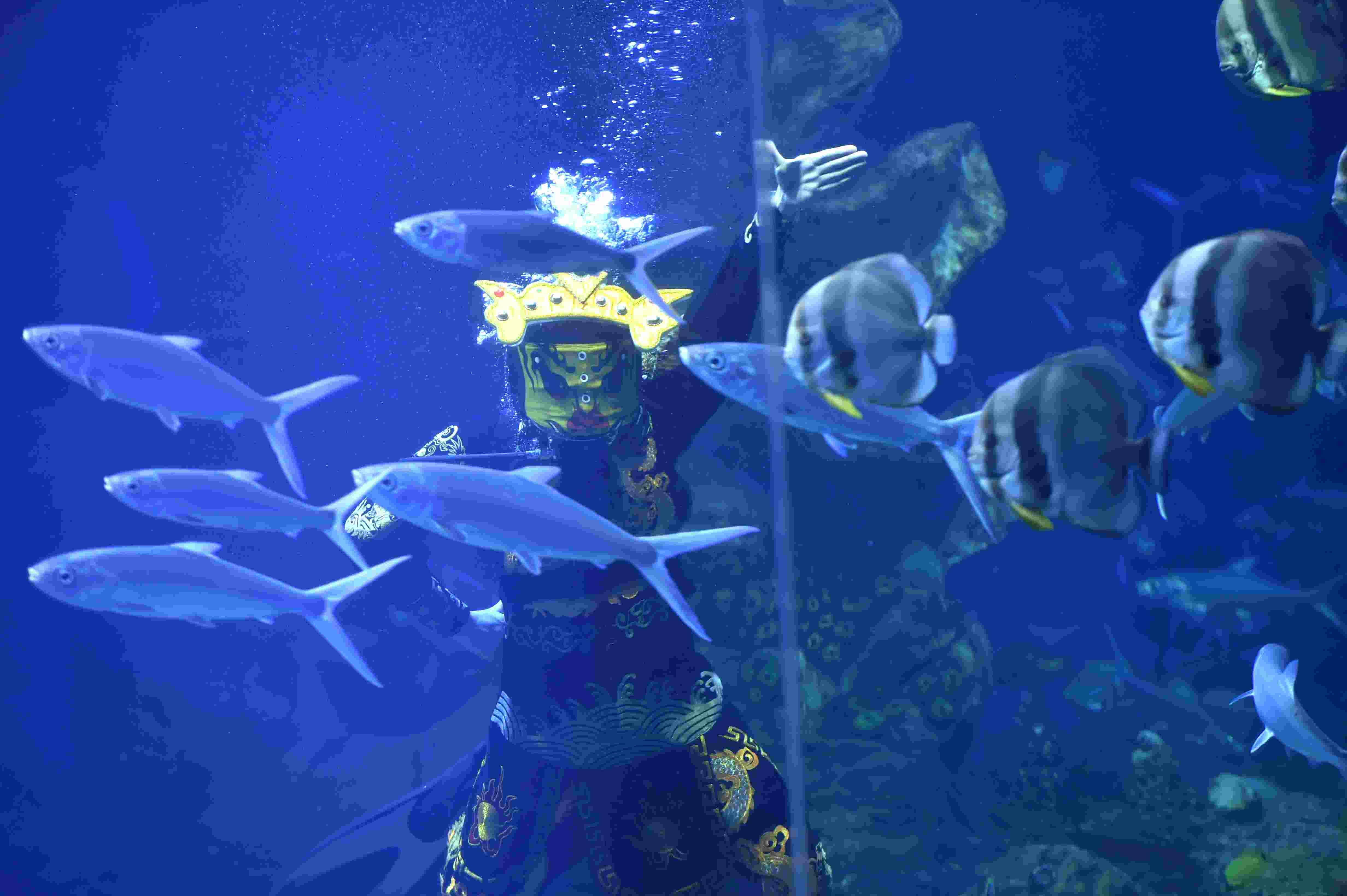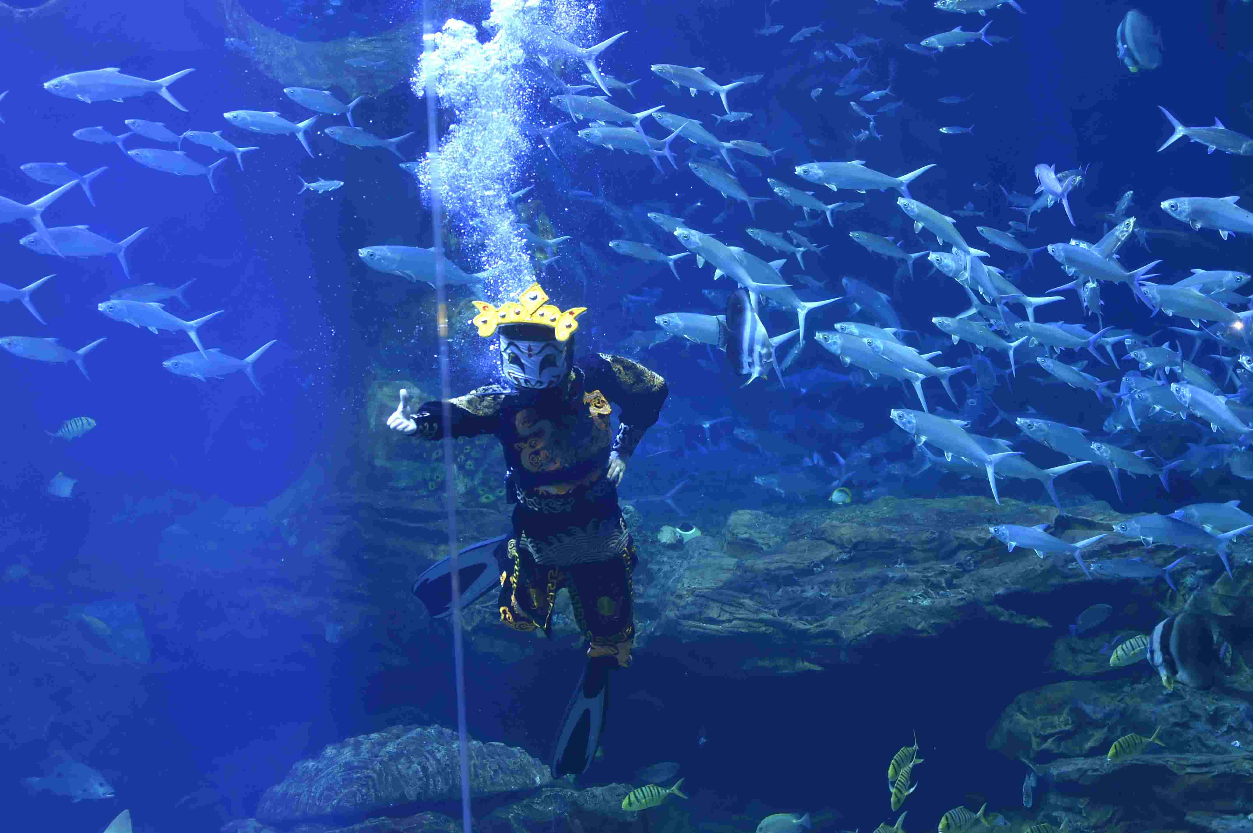2023年4月28日,演員在貴陽市多彩貴州城極地海洋世界表演水下川劇“變臉”。