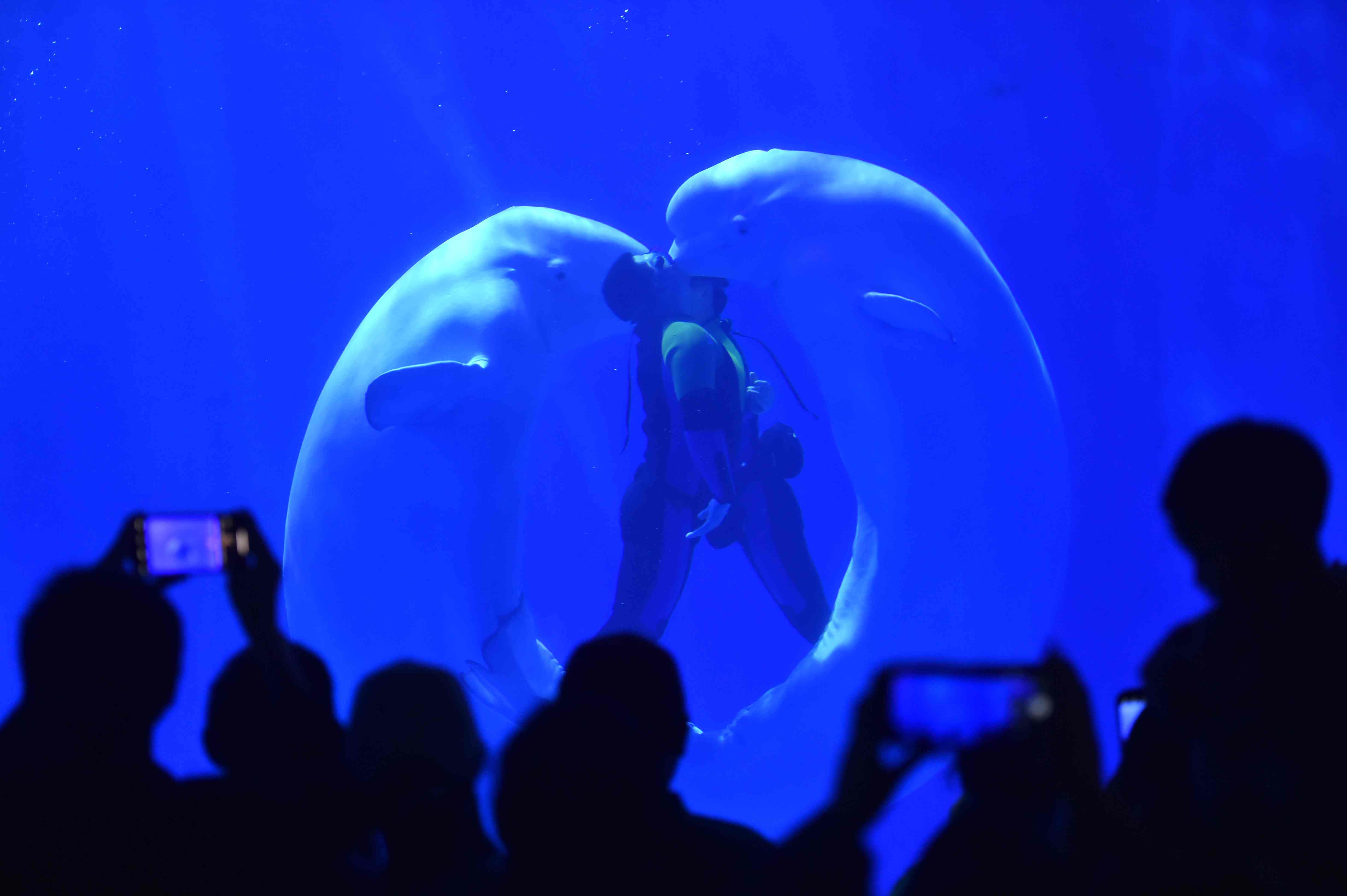 2023年4月28日,演員在貴陽市多彩貴州城極地海洋世界表演“白鯨之吻”。