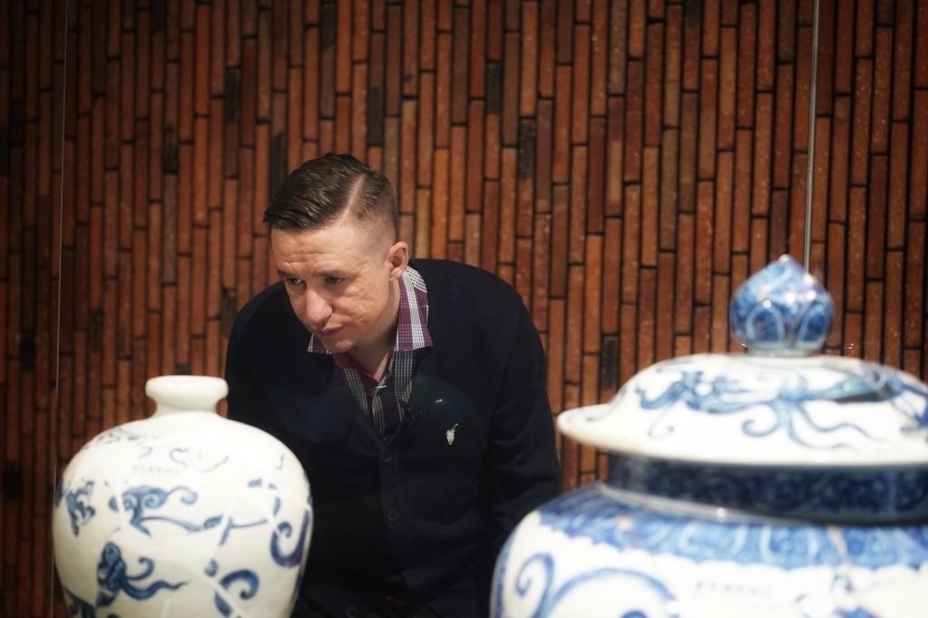 在江西景德鎮(zhèn)御窯博物院的展柜燈光下,一件青花瓷盤散發(fā)著藍(lán)白相間的光澤,疏密有致的葡萄紋在盤中心環(huán)繞生長(zhǎng),紋理細(xì)節(jié)清晰可見。這件燒制于約600年前的宣德青花葡萄紋菱口盤,吸引了來(lái)自烏茲別克斯坦的留學(xué)生紹夫卡特·沙穆拉托夫的目光。