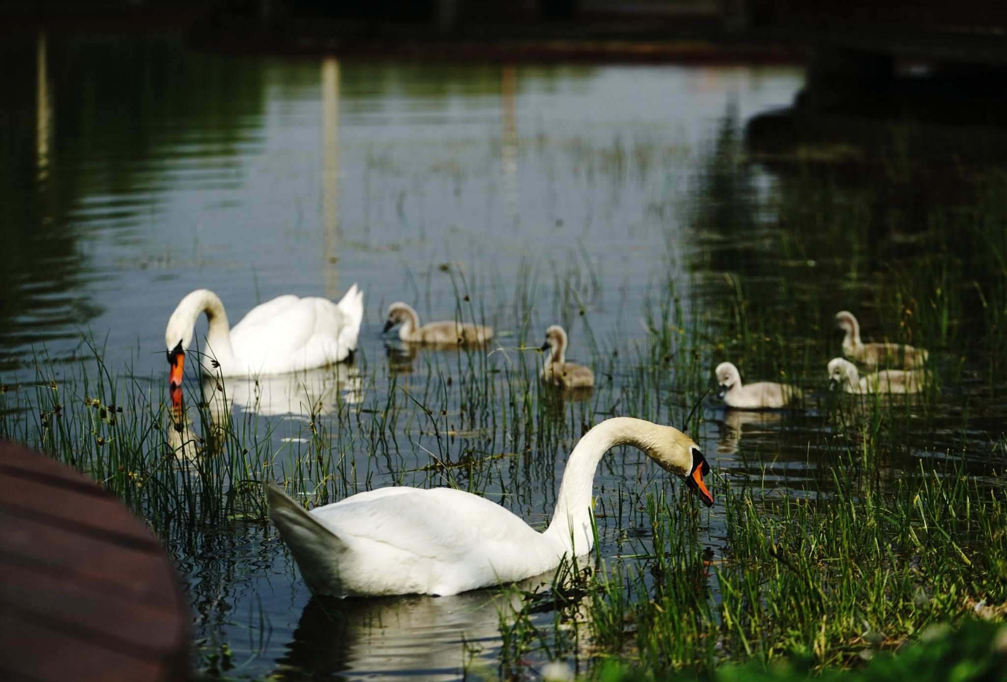 2023年4月26日,鄭州北龍湖濕地公園,天鵝“父母”帶領7只天鵝寶寶在湖中覓食嬉水。視覺中國