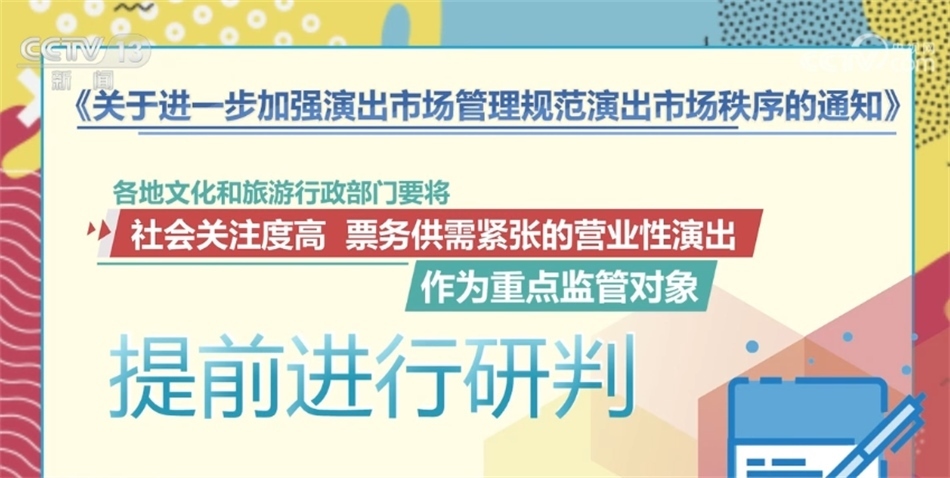 通知指出,各地文化和旅游行政部門要依法做好演出活動的審批工作,將屬于營業(yè)性演出范圍的農(nóng)村集鎮(zhèn)演出、流動性演出納入審批管理,嚴(yán)格審核演出舉辦單位的資質(zhì)文件,統(tǒng)一審批要求,做好內(nèi)容監(jiān)管。對不符合法定審批要求的,堅決不予批準(zhǔn)。文化和旅游行政部門要定期對演出場所進(jìn)行檢查,督促演出場所定期開展設(shè)施設(shè)備檢查,落實安全生產(chǎn)責(zé)任制。督促演出場所建立完善現(xiàn)場巡查制度,指定專人負(fù)責(zé)演出活動的巡查,做好現(xiàn)場觀眾管理,堅決防止擁擠、踩踏等事故發(fā)生,確保演出現(xiàn)場安全。各地文化和旅游行政部門要將社會關(guān)注度高、票務(wù)供需緊張的營業(yè)性演出作為重點監(jiān)管對象,提前進(jìn)行研判。督促演出舉辦單位、演出票務(wù)經(jīng)營單位面向市場公開銷售的營業(yè)性演出門票數(shù)量,不得低于核準(zhǔn)觀眾數(shù)量的70%。對在票務(wù)經(jīng)營中發(fā)現(xiàn)有炒票問題或可能造成不良影響的,應(yīng)當(dāng)及時約談演出舉辦單位和演出票務(wù)經(jīng)營單位,督促整改。要聯(lián)合屬地公安、市場監(jiān)管等部門,依法打擊“黃牛”炒票、虛假宣傳等違法違規(guī)行為,切實保障消費者合法權(quán)益。
