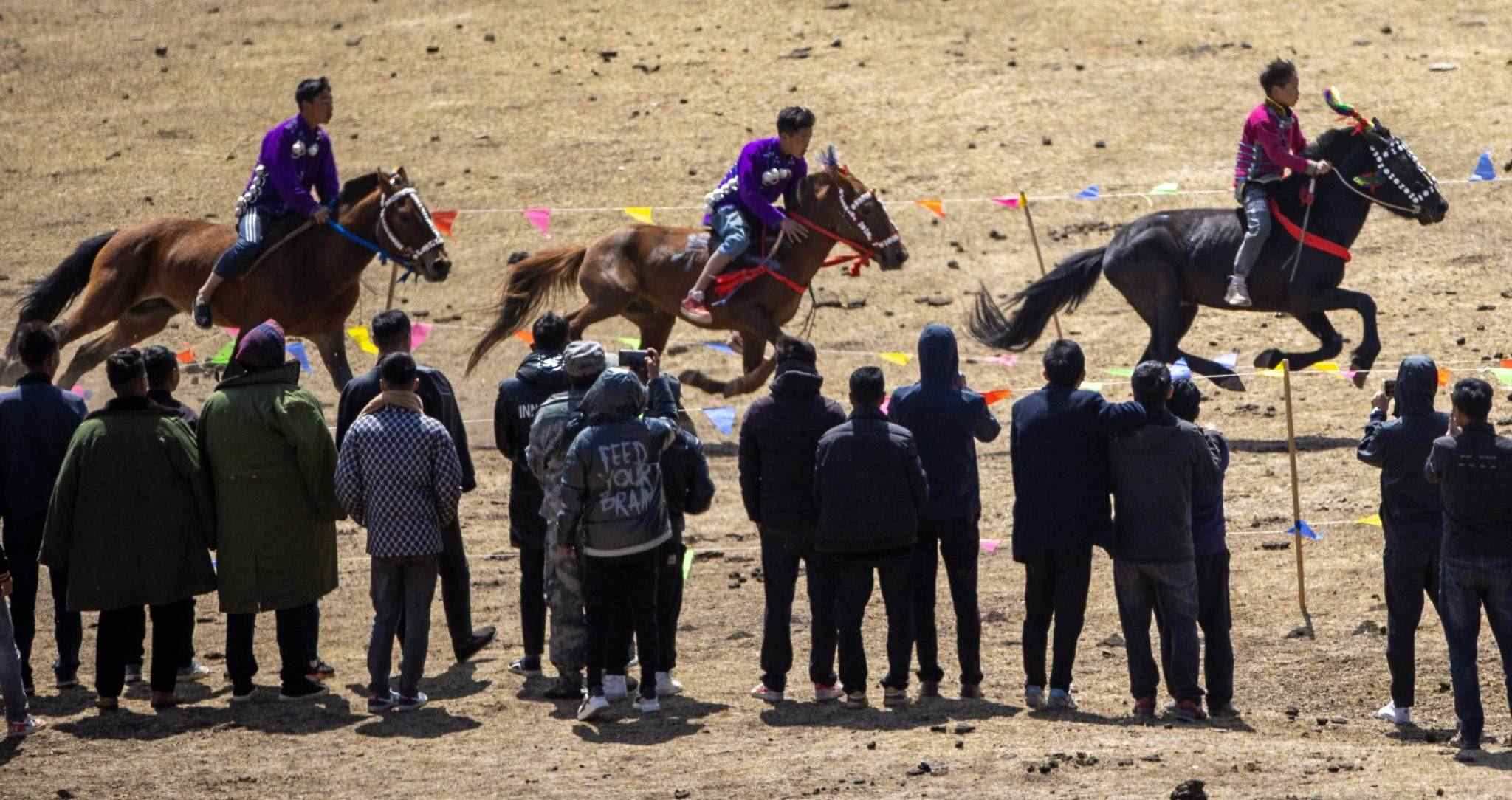 2023年4月25日,四川涼山,普格縣黎安鄉(xiāng)??诹鹤樱瑐鹘y(tǒng)的彝族賽馬比賽拉來帷幕。視覺中國