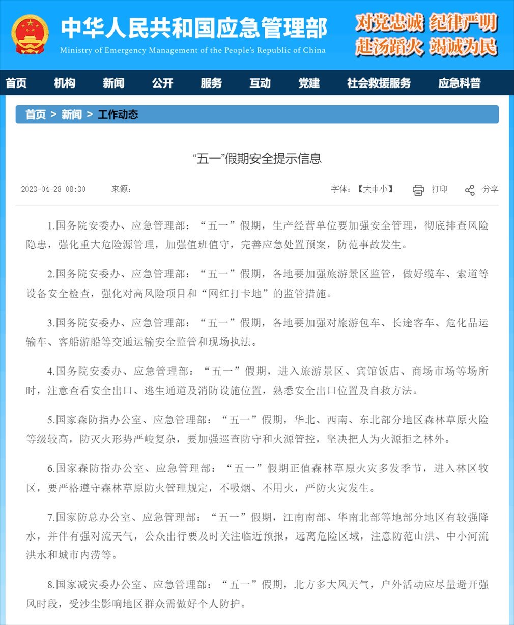 1.國(guó)務(wù)院安委辦、應(yīng)急管理部:“五一”假期,生產(chǎn)經(jīng)營(yíng)單位要加強(qiáng)安全管理,徹底排查風(fēng)險(xiǎn)隱患,強(qiáng)化重大危險(xiǎn)源管理,加強(qiáng)值班值守,完善應(yīng)急處置預(yù)案,防范事故發(fā)生。