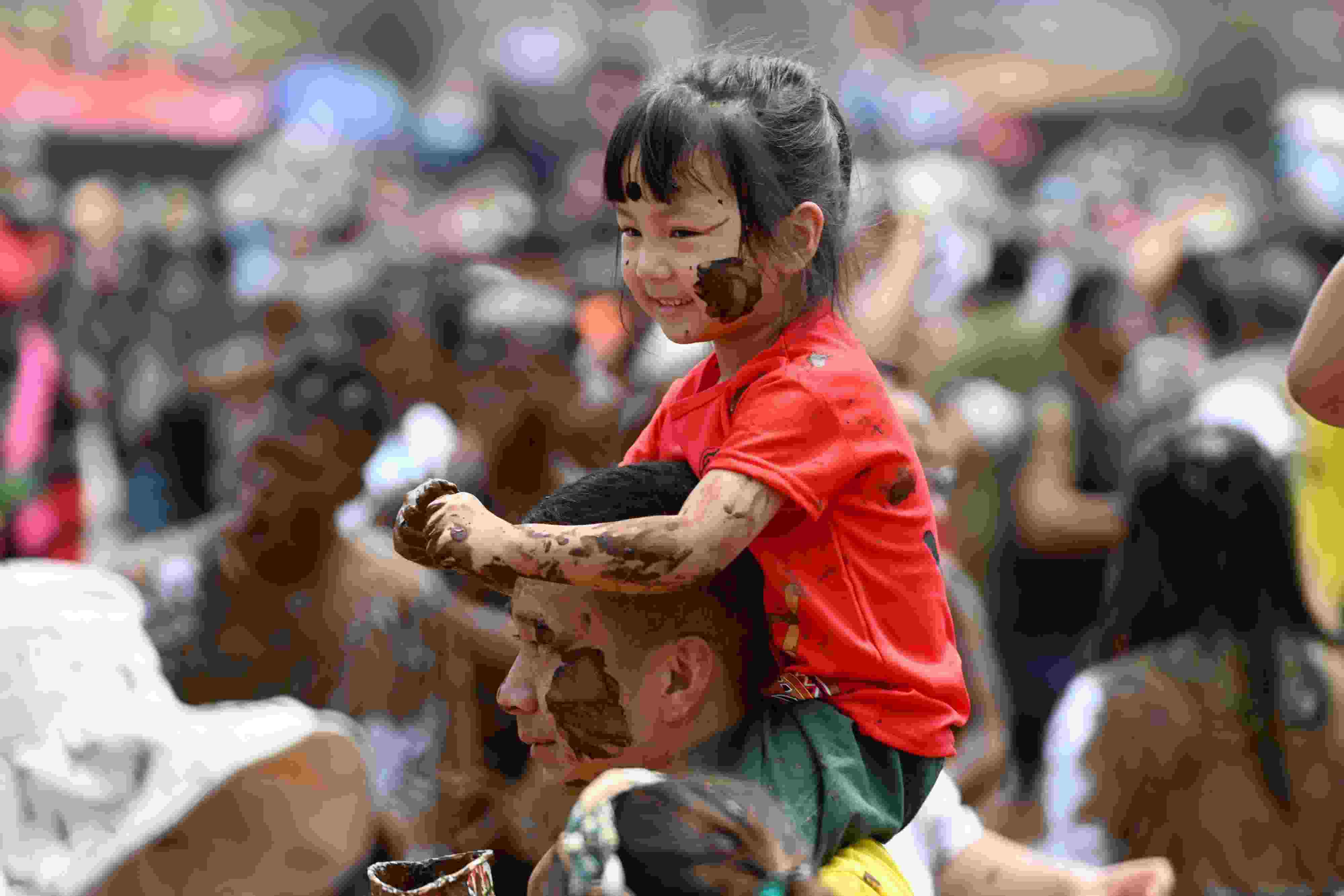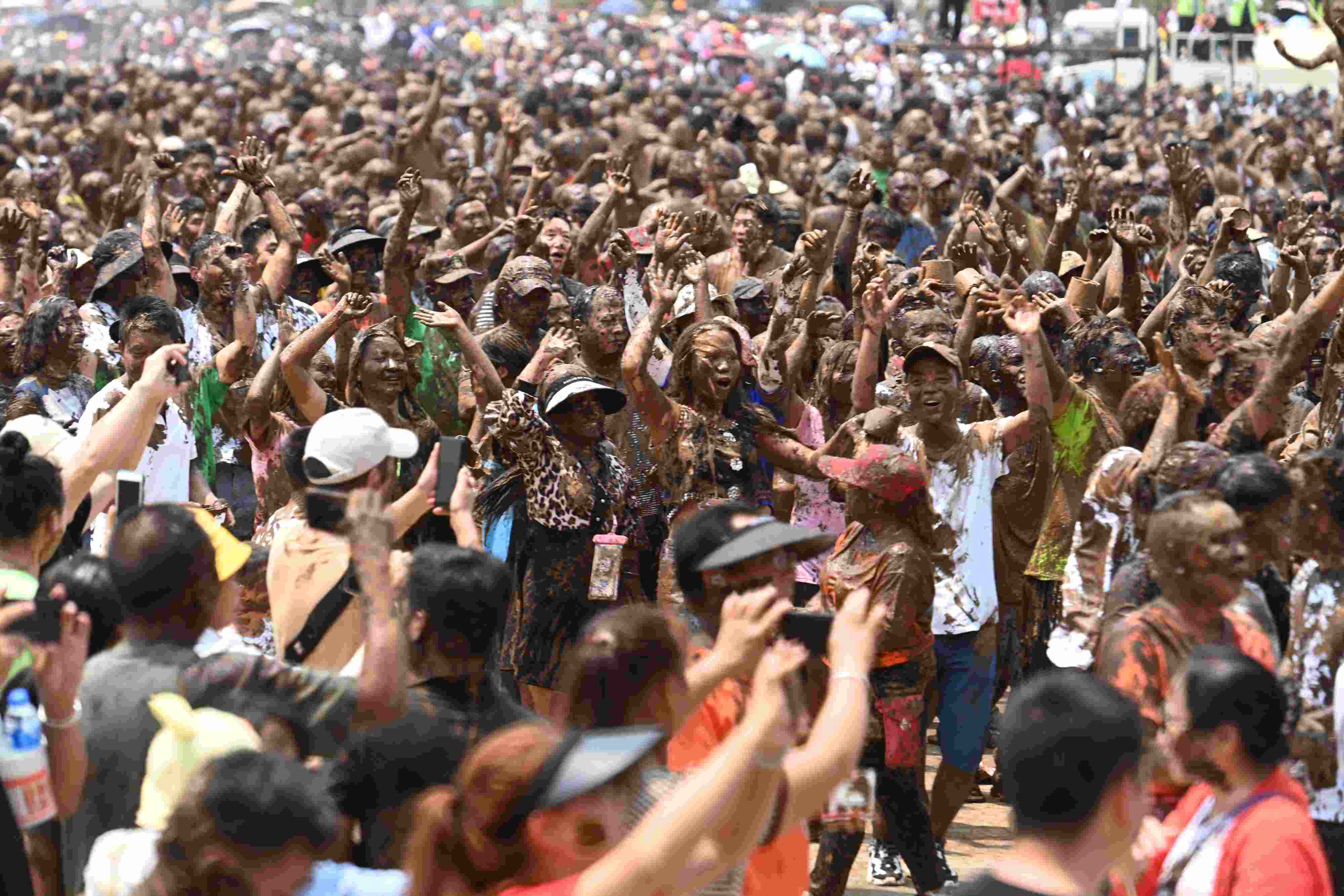 2023年4月30日,云南臨滄,游客相互抹泥表示祝福。當(dāng)日,2023年中國佤族司崗里摸你黑狂歡節(jié)在云南省臨滄市滄源佤族自治縣啟幕。人們用天然原料“娘布洛”配置而成的涂料相互涂抹表示祝福,摸得越黑,代表快樂幸福越長久。 視覺中國