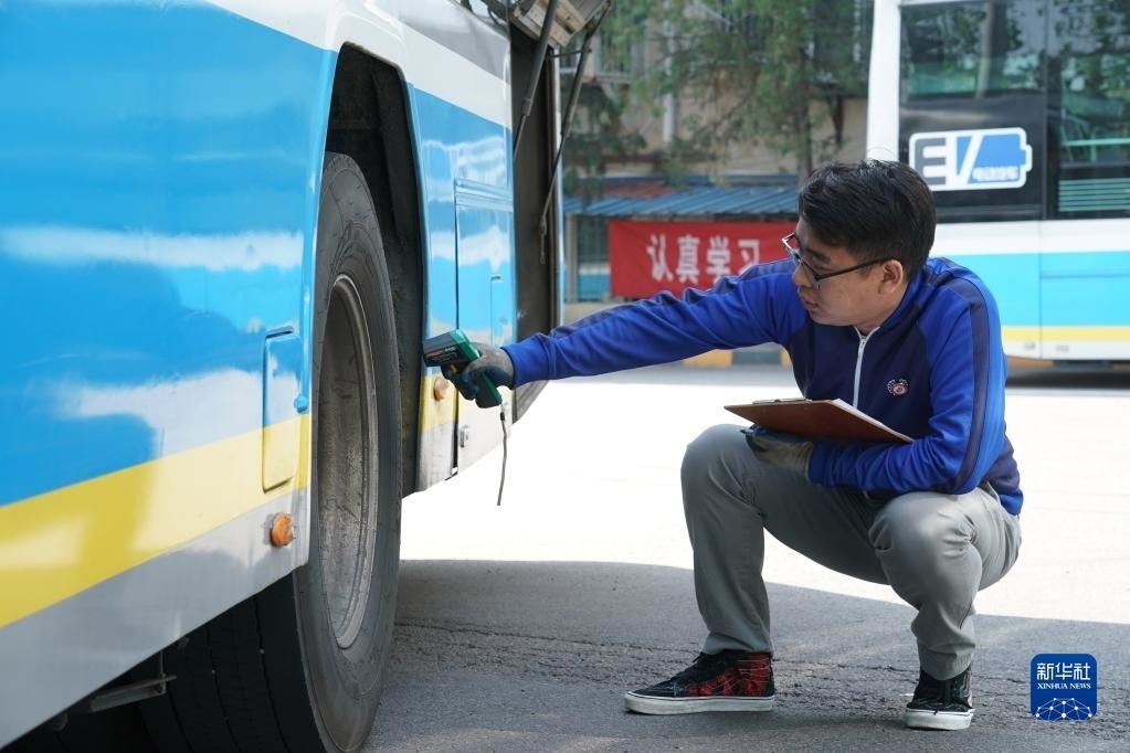5月1日,在位于北京市朝陽(yáng)區(qū)的柳芳公交場(chǎng)站,技術(shù)員王陸斌對(duì)車輪測(cè)溫。