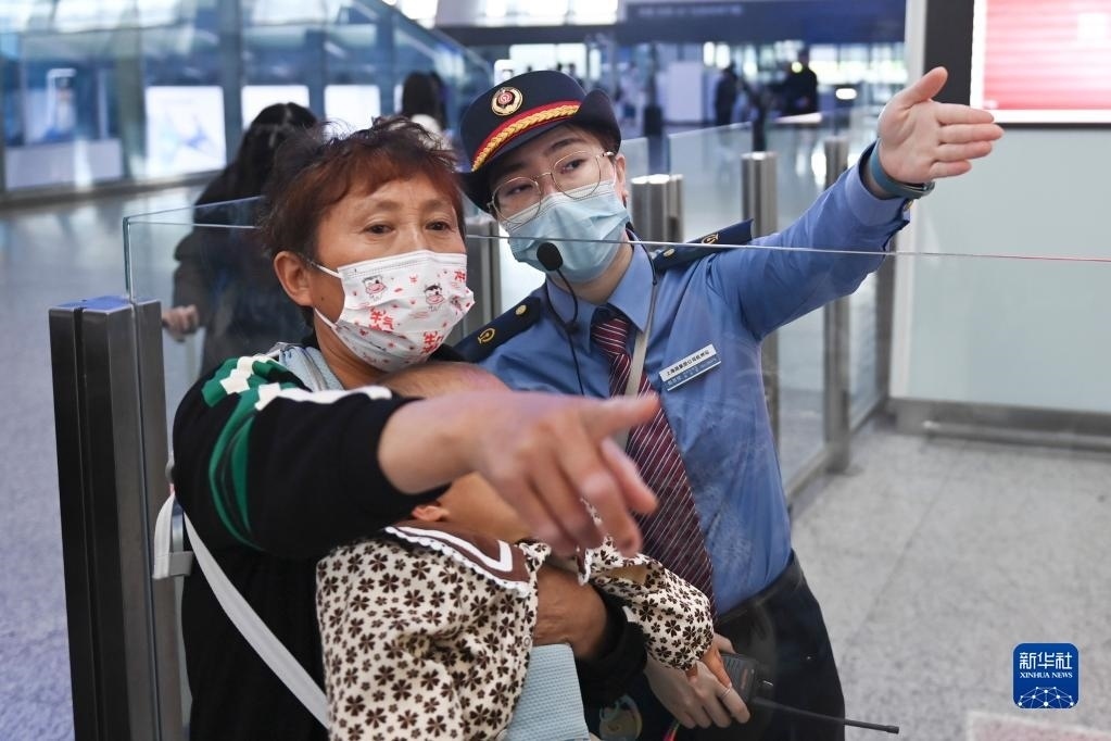 5月1日,在杭州東站候車大廳,客運(yùn)員陳思悅引導(dǎo)旅客前往檢票口。