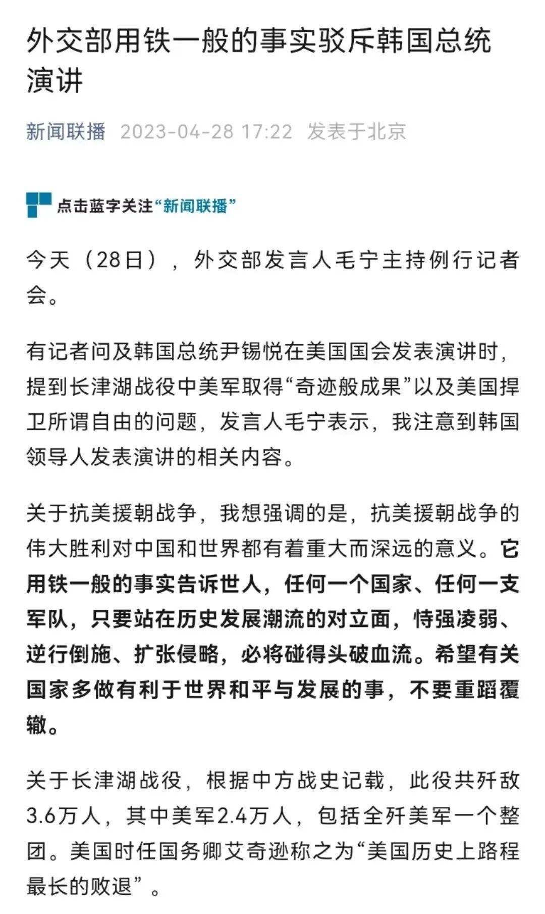 根據(jù)外媒報(bào)道,韓國(guó)總統(tǒng)4月27日在美國(guó)國(guó)會(huì)發(fā)表演講稱,美國(guó)海軍陸戰(zhàn)隊(duì)第一師在長(zhǎng)津湖戰(zhàn)役中取得了所謂的“奇跡般成果”。