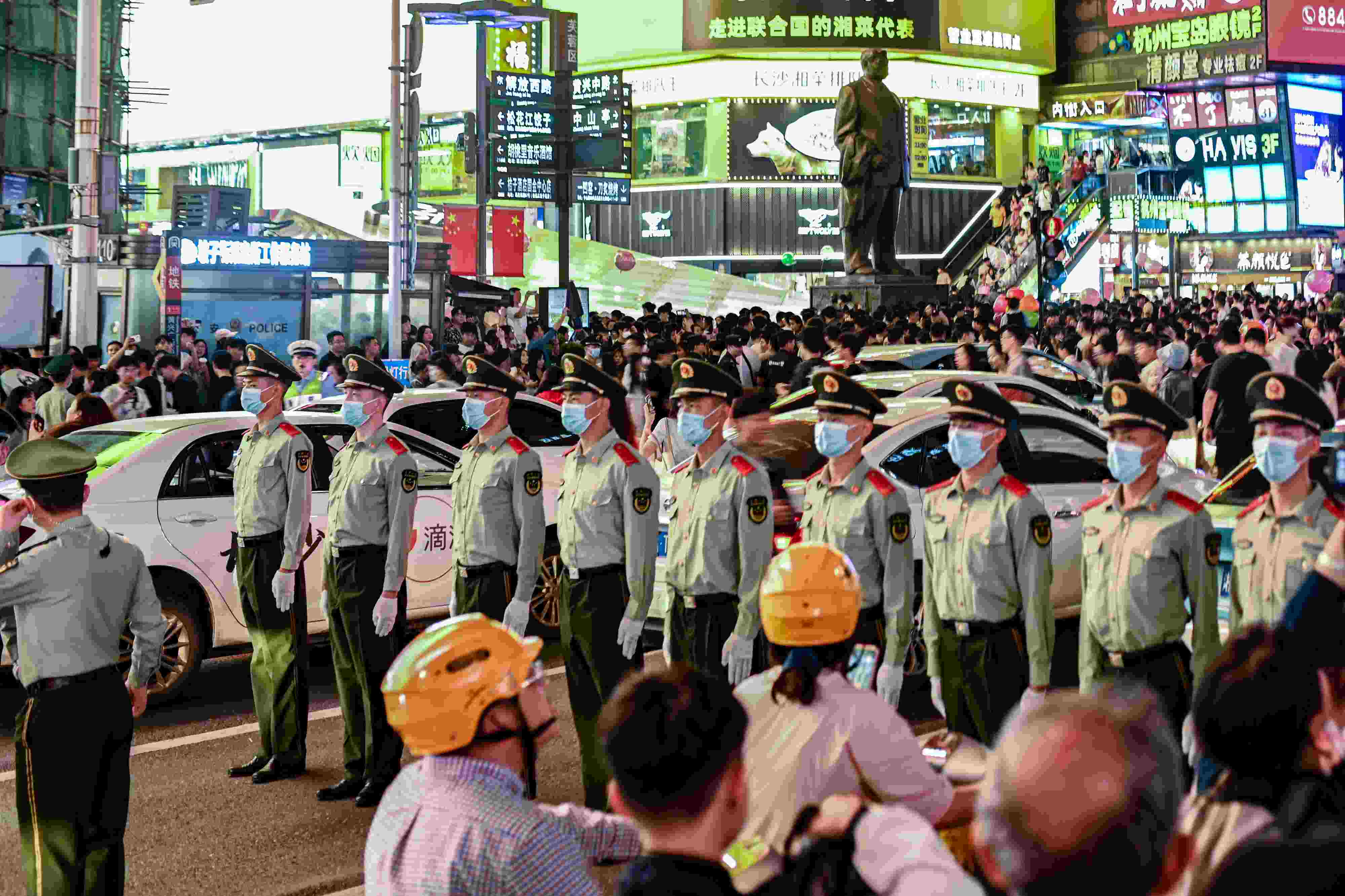 2023年5月1日,長沙,“五一”小長假,五一商圈成為眾多游客必到打卡地,為了保障人民群眾的安全,武警長沙支隊官兵同長沙公安民警一道,在市中心解放西路與黃興中路的十字路口,筑起“人墻”,守護(hù)行人安全通行。 視覺中國