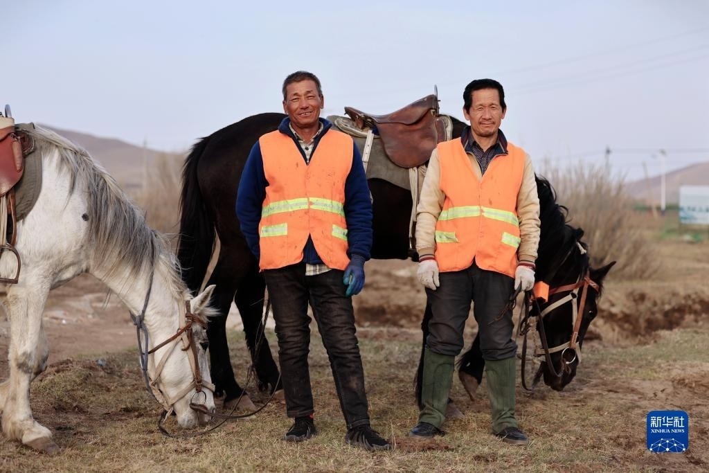 5月2日,河北省承德市豐寧滿族自治縣大灘鎮(zhèn)扎拉營村的護(hù)林員趙世海(右)和羅金寶在海留圖國家濕地公園修復(fù)護(hù)欄。