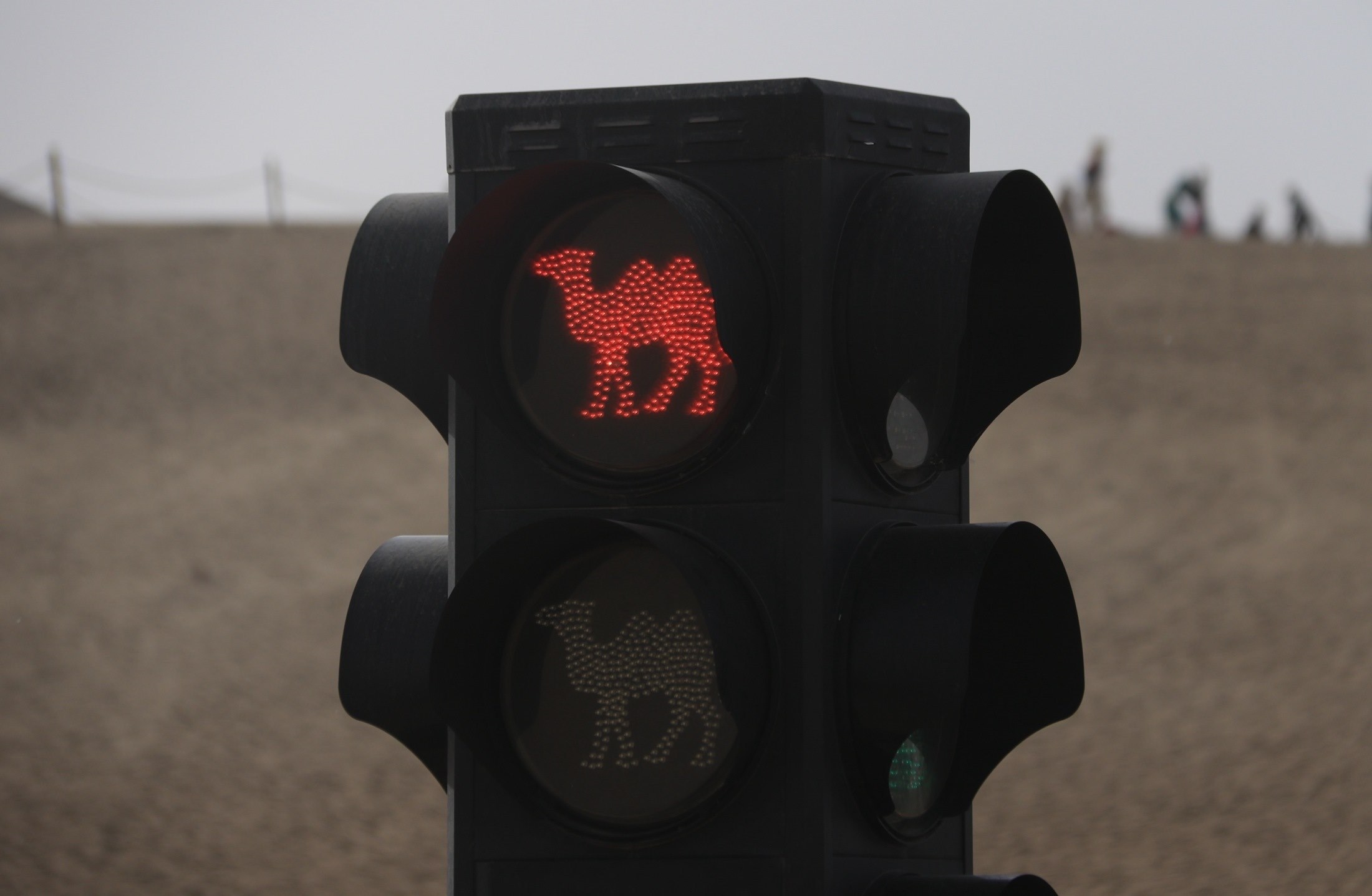 甘肅酒泉:月牙泉景區(qū)內(nèi)設(shè)置駱駝紅綠燈