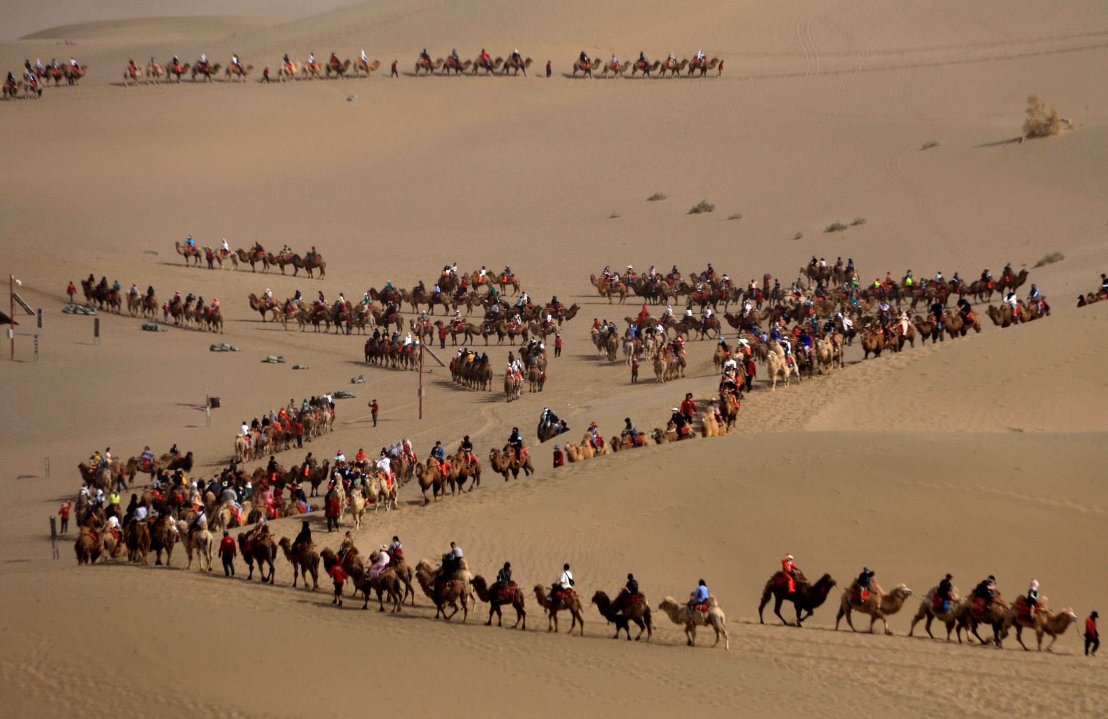 2023年5月1日,甘肅酒泉,敦煌市鳴沙山月牙泉景區(qū),游人如織。