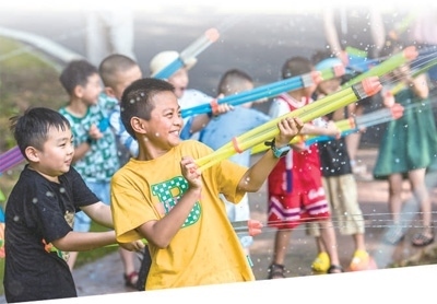 安徽省蕪湖市孫村鎮(zhèn)一家鄉(xiāng)村房車露營(yíng)地里,小朋友們?cè)陂_心地打水仗。肖本祥攝(人民視覺)