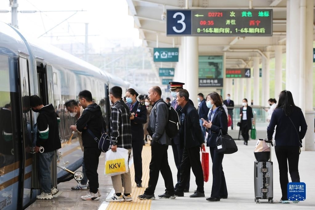 5月3日,旅客在寶蘭高鐵甘肅定西北站站臺(tái)乘車出行。