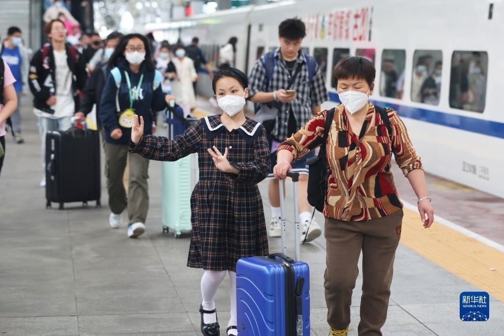 5月3日,剛下車的旅客在南京火車站準(zhǔn)備出站。