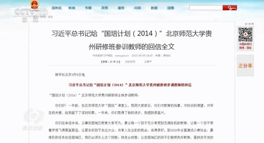 2014年9月,黃俊瓊和49名來自貴州的小學(xué)骨干語文教師到北京師范大學(xué)參加“中小學(xué)教師國家級(jí)培訓(xùn)計(jì)劃”,也就是“國培計(jì)劃”。培訓(xùn)期間,有件事讓她終身難忘。當(dāng)時(shí),習(xí)近平總書記到北京師范大學(xué)考察,專門和他們進(jìn)行了座談。