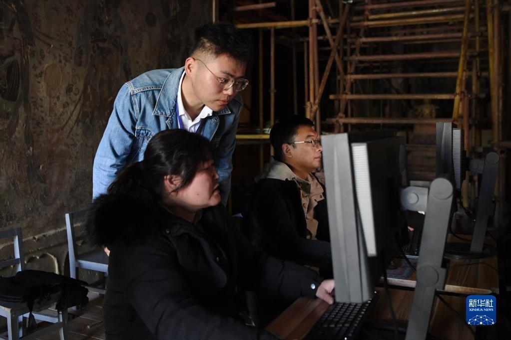 敦煌研究院文物數(shù)字化保護(hù)團(tuán)隊科研人員安慧莉在制定壁畫采集方案(4月25日攝)。