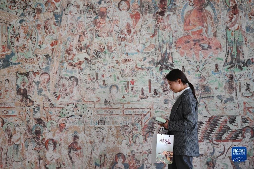敦煌研究院文物數(shù)字化保護(hù)團(tuán)隊創(chuàng)意營銷人員廖雪婷從一幅高保真復(fù)制壁畫前走過(4月25日攝)。
