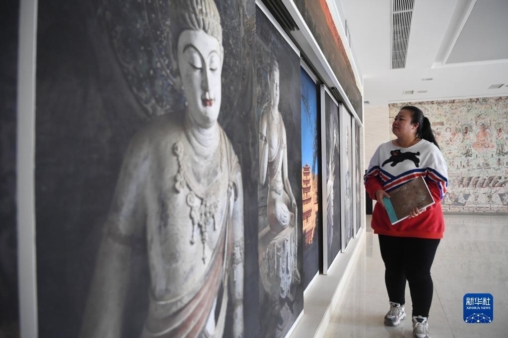 敦煌研究院文物數(shù)字化保護(hù)團(tuán)隊圖像處理人員年海麗從莫高窟照片墻前走過(4月25日攝)。