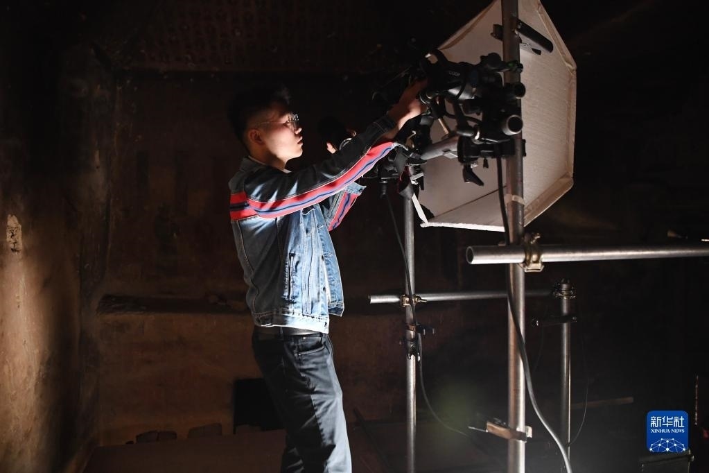 敦煌研究院文物數(shù)字化保護(hù)團(tuán)隊圖像采集人員熊業(yè)騰在洞窟內(nèi)調(diào)試設(shè)備,準(zhǔn)備進(jìn)行壁畫圖像采集(4月25日攝)。