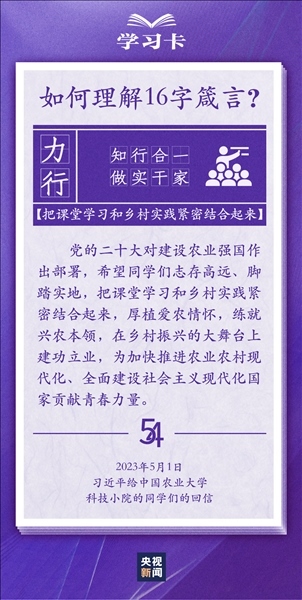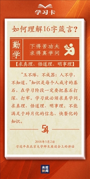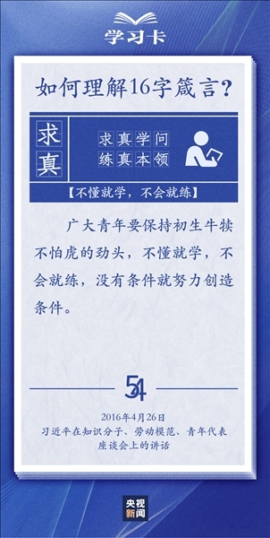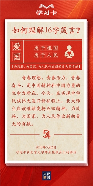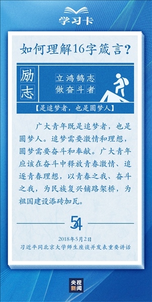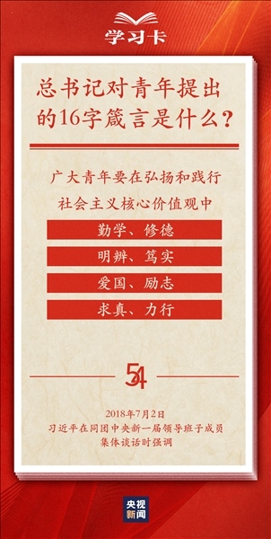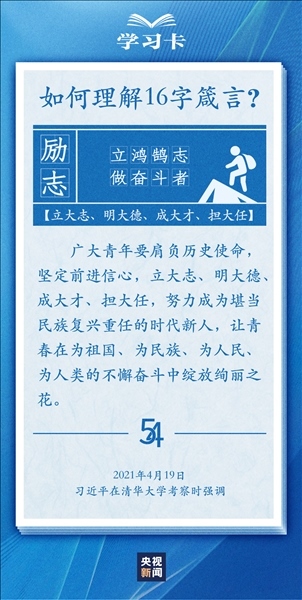 青春,是人生最美的時(shí)光。青年,是國(guó)家的未來和民族的希望。每每與青年對(duì)話,習(xí)近平總書記無不囑托青年“立大志”“堅(jiān)定理想信念”“擔(dān)當(dāng)復(fù)興大任”,言之諄諄,意之殷殷。對(duì)于新時(shí)代青年如何走好人生路,習(xí)近平總書記2018年提出十六字箴言,字短意長(zhǎng)。今天,一起學(xué)習(xí)↓