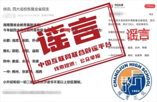 真相:近日,一些網(wǎng)站和自媒體平臺發(fā)布“今年起,長郡中學(xué)、雅禮中學(xué)、湖南師大附中、長沙市一中等長沙‘四大名校’初升高恢復(fù)全省招生”的信息引發(fā)關(guān)注。5月4日,湖南省教育廳對此發(fā)布聲明稱,此消息為不實消息。湖南省自2021年全面規(guī)范普通高中招生,禁止跨區(qū)域招生,并對違規(guī)招生行為進行嚴(yán)肅查處。請大家不信謠不傳謠。(來源:湖南省教育廳微信公眾號)