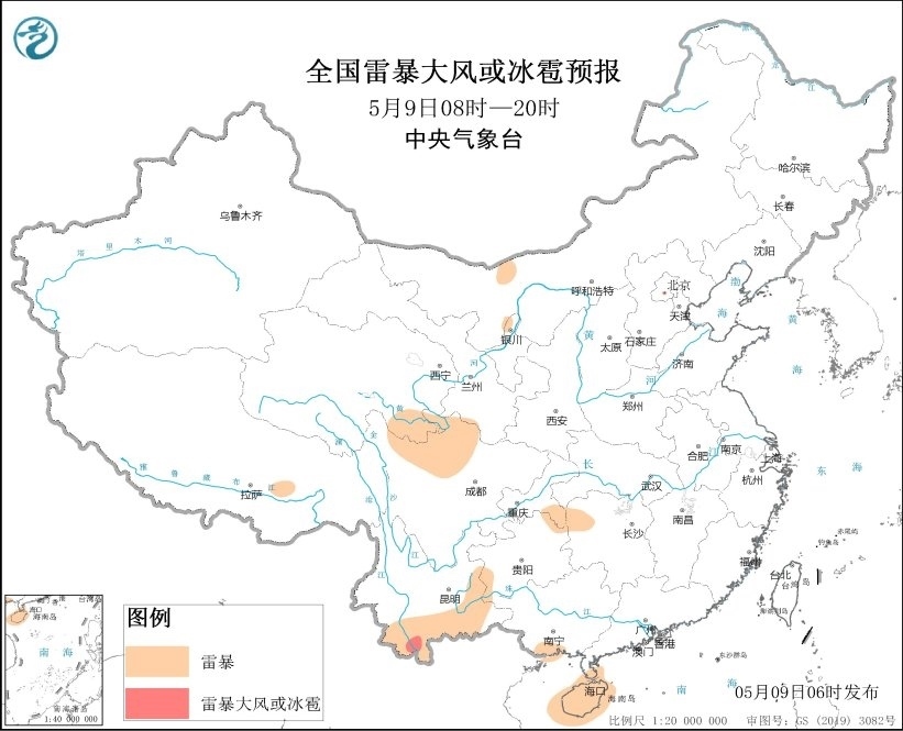 預計5月9日08時至10日08時,云南西南部、海南島東北部和西南部等地的部分地區(qū)將有短時強降水天氣,小時雨量20-30毫米,局地可達50毫米以上;另外,云南西南部局地將有雷暴大風或冰雹天氣。