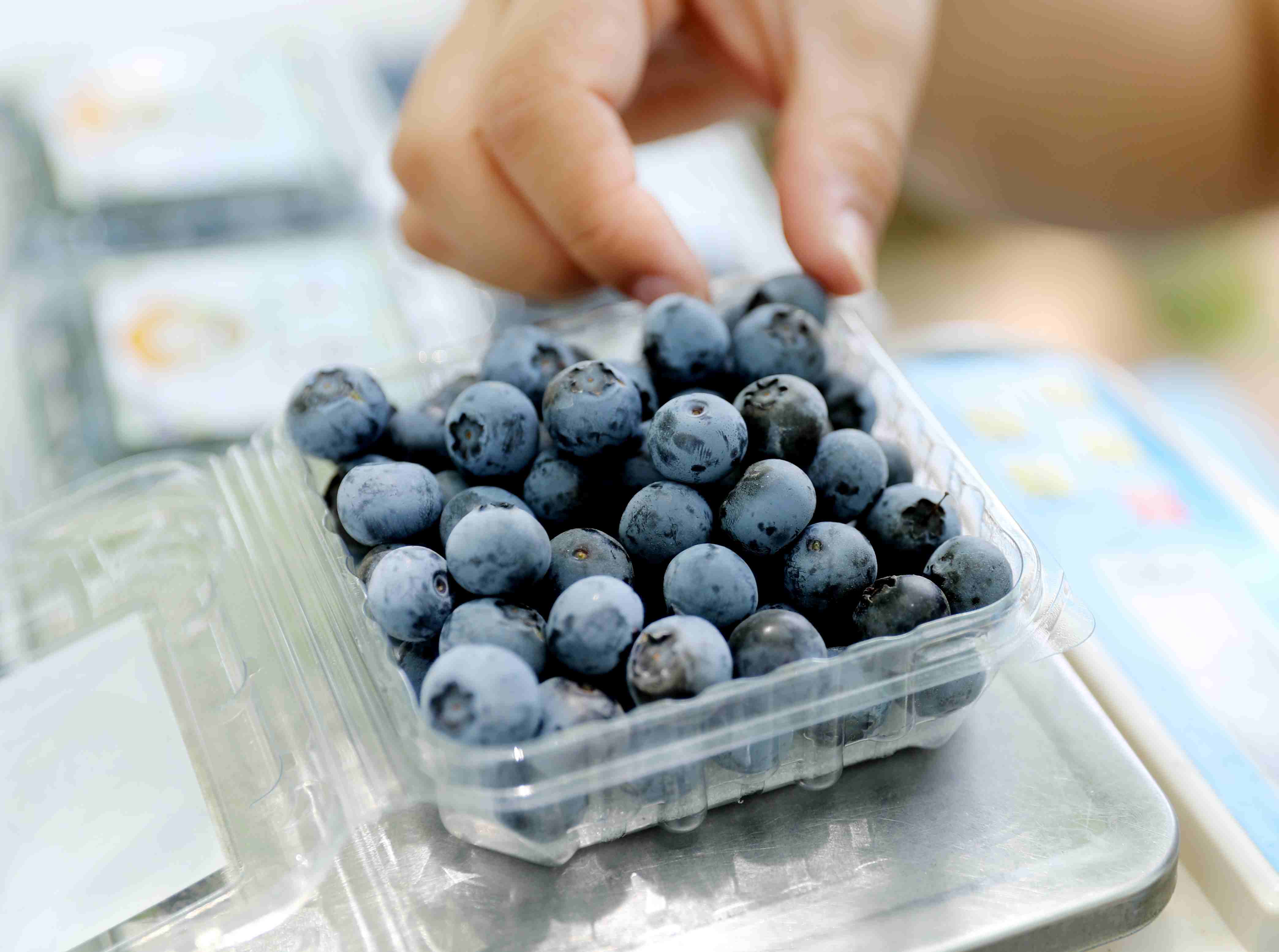 5月7日,青島西海岸新區(qū)寶山鎮(zhèn)一種植戶在分裝藍莓。