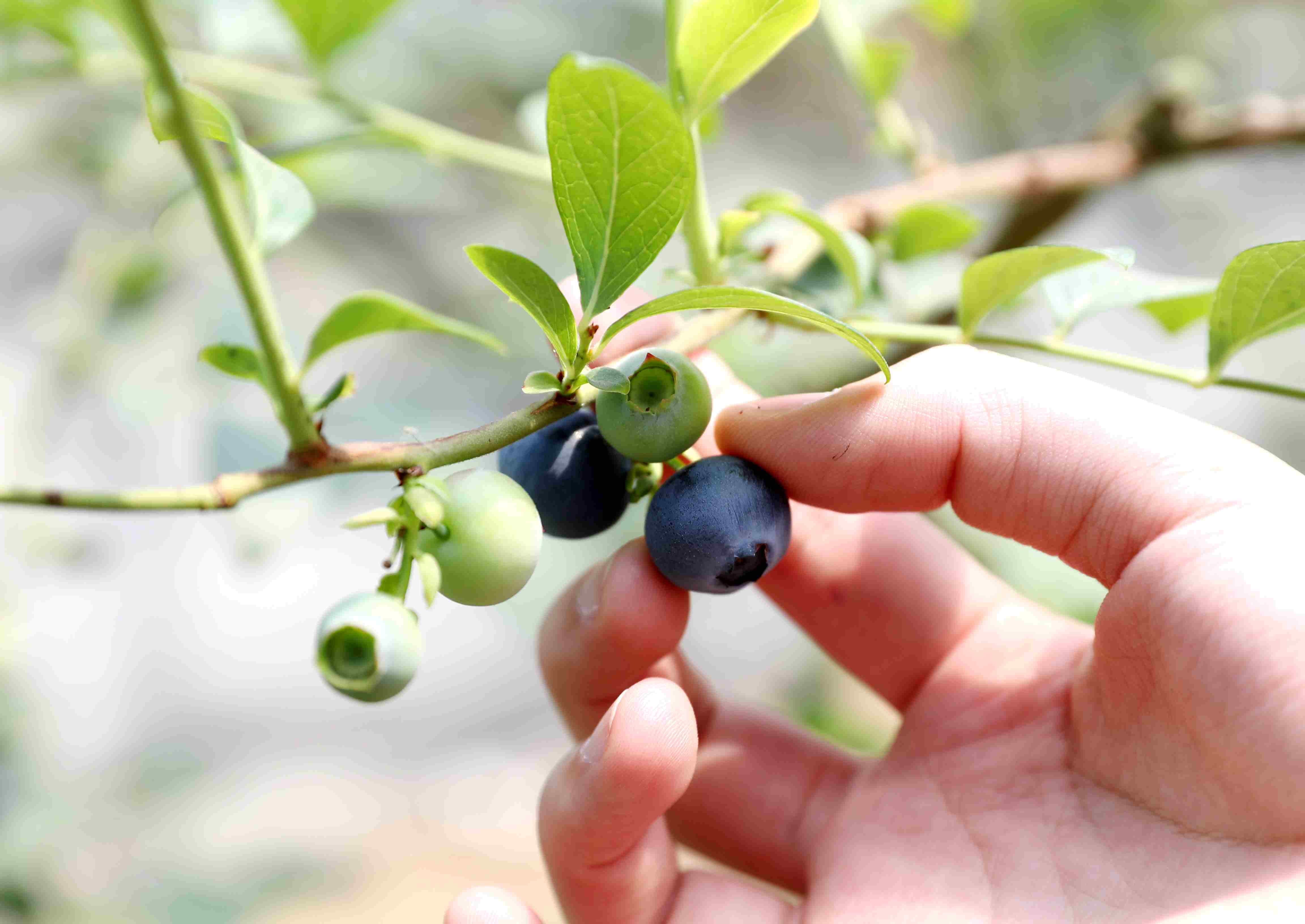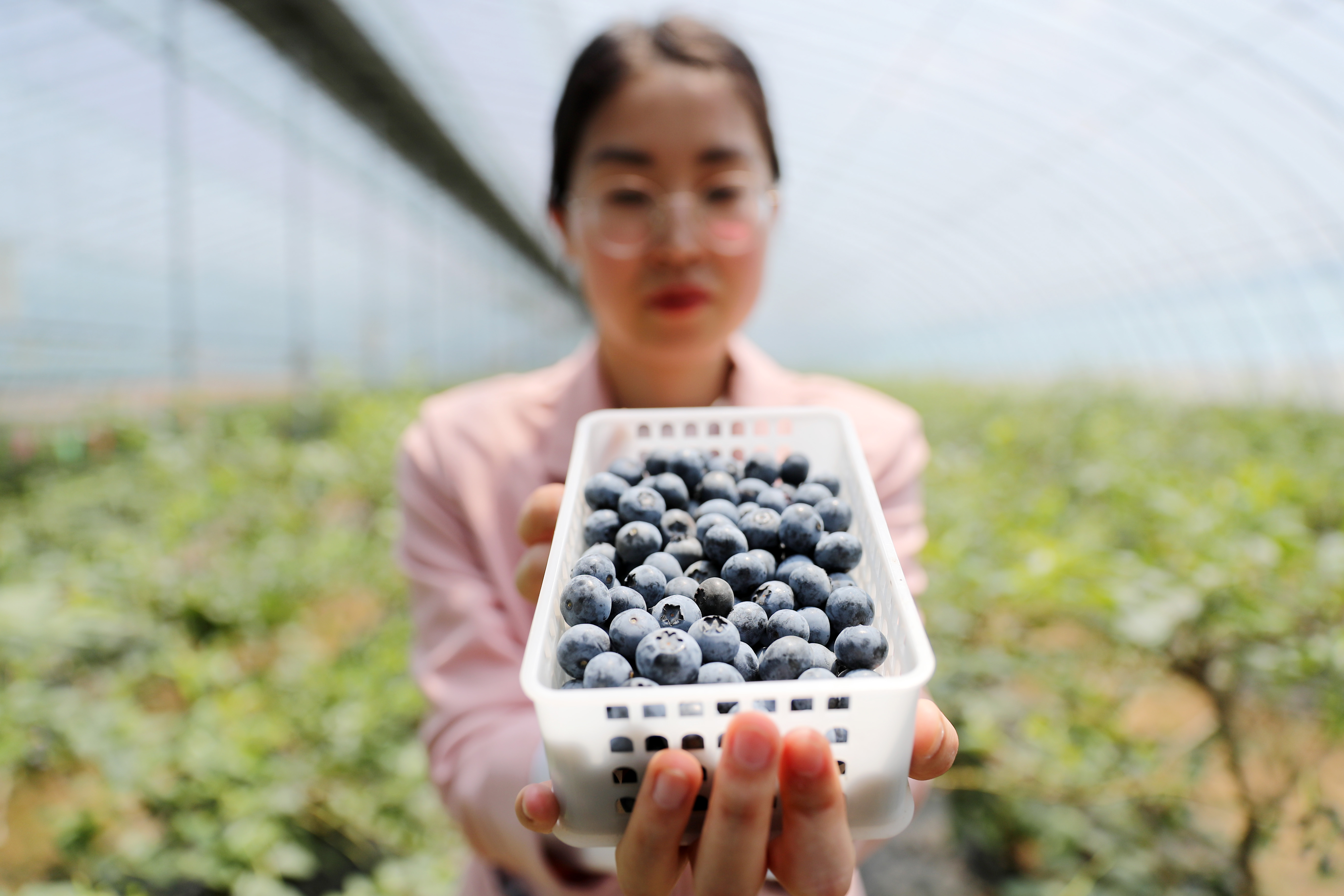 5月7日,市民在青島西海岸新區(qū)寶山鎮(zhèn)一藍莓種植大棚里采摘藍莓。 張進剛 攝