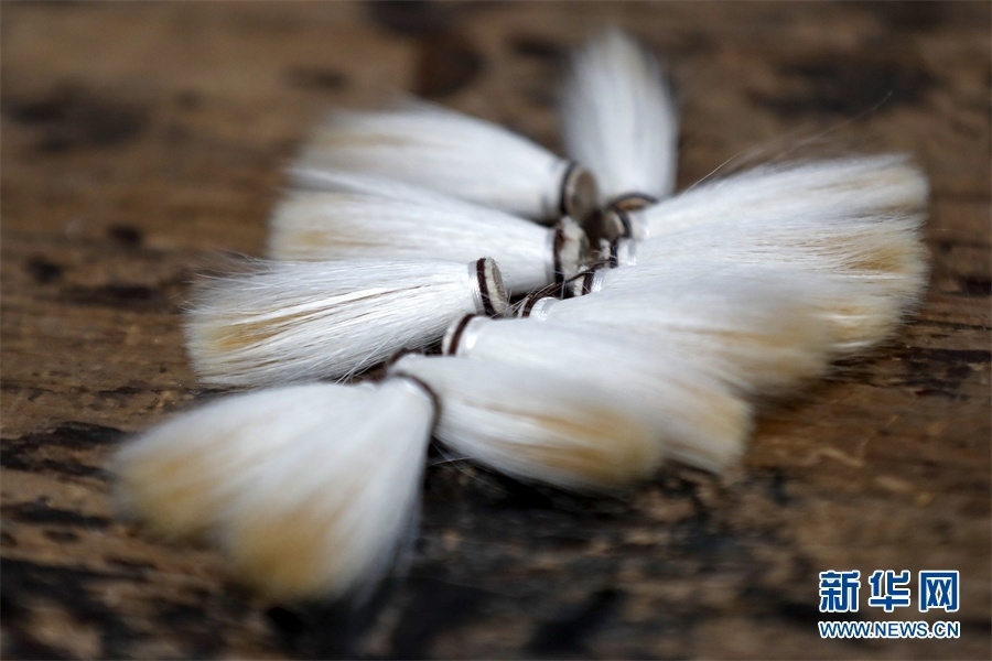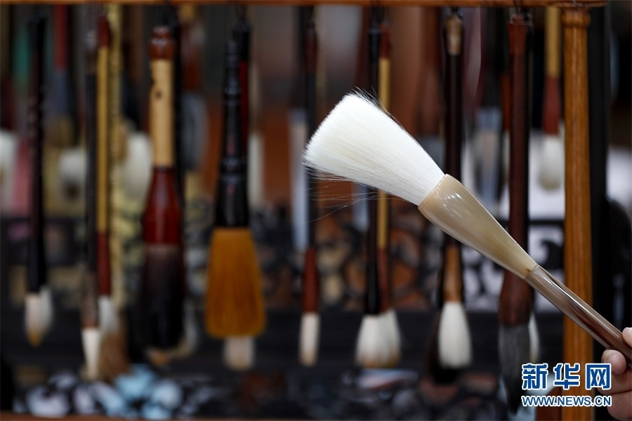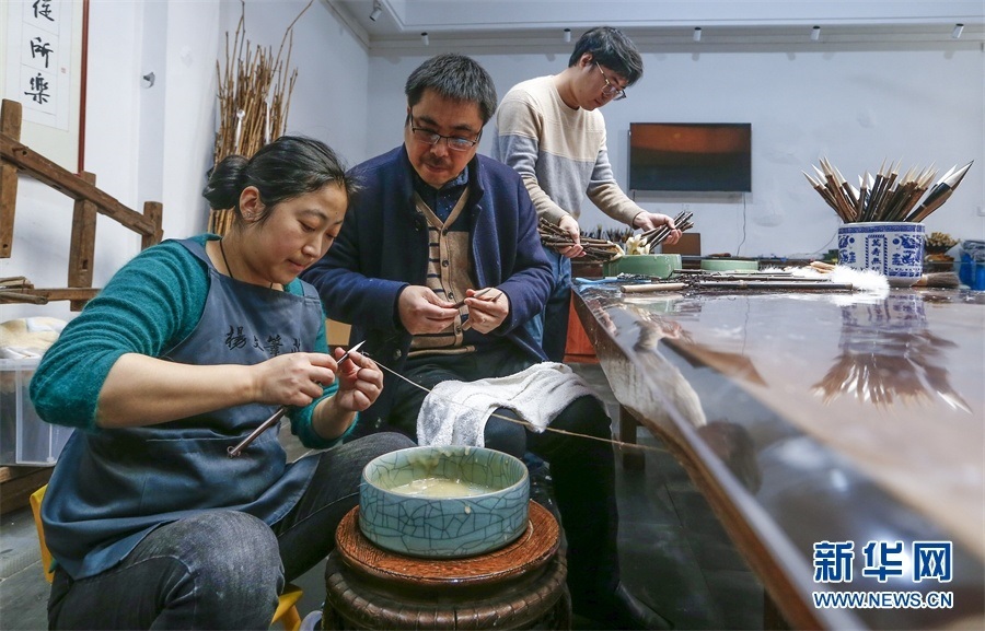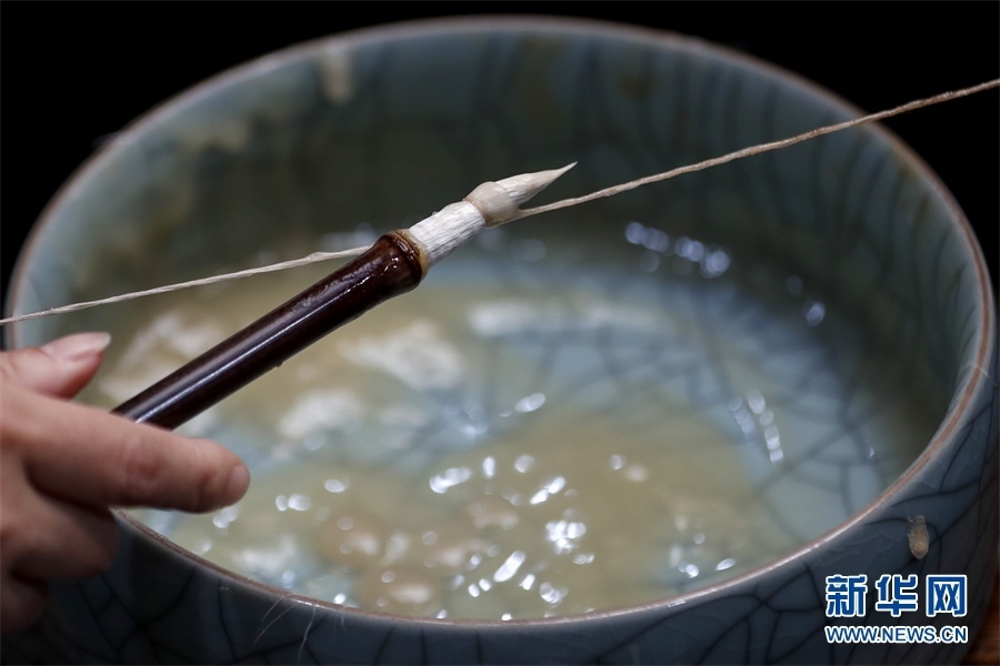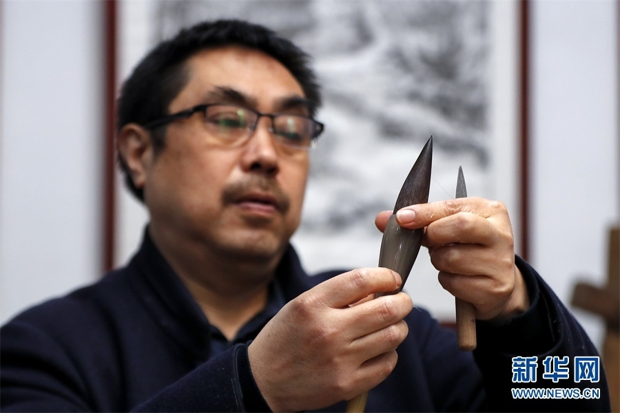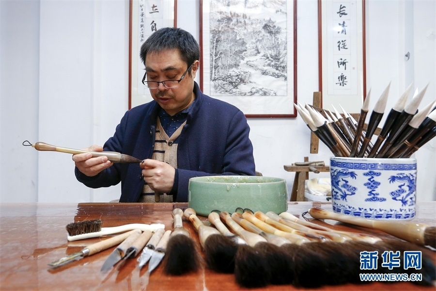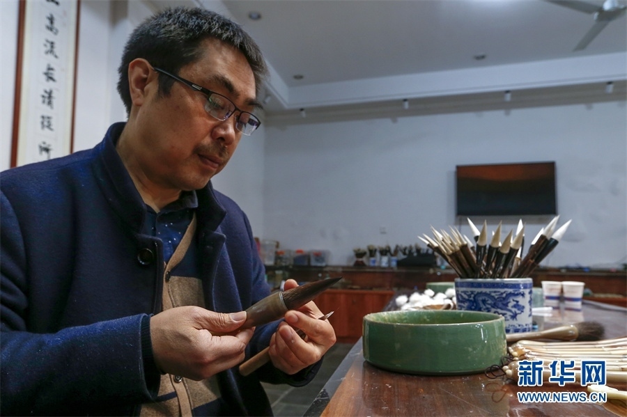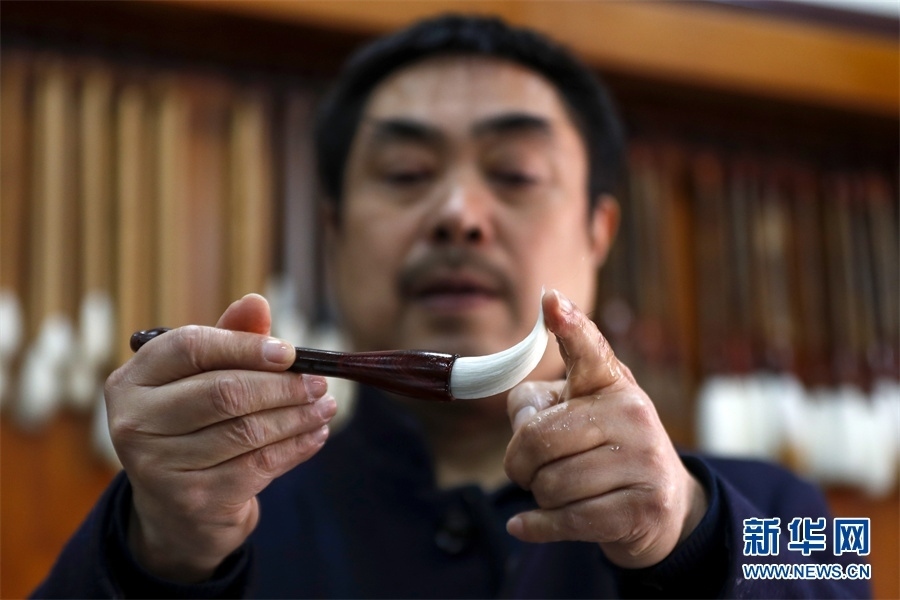 一支好的徽筆,不僅要保留傳統(tǒng)工藝,且要在原基礎(chǔ)上不斷創(chuàng)新、改良。楊文尤其重視書(shū)畫(huà)家對(duì)筆的使用反饋:“因?yàn)樗麄儗?duì)用筆最挑剔,而且現(xiàn)代書(shū)畫(huà)家創(chuàng)作方式和作品不斷創(chuàng)新,對(duì)毛筆也有新的要求,他們提出的要求我總是盡力去滿足,也使得制筆技藝進(jìn)一步得到了提高。” 新華網(wǎng)發(fā)(施亞磊 攝)