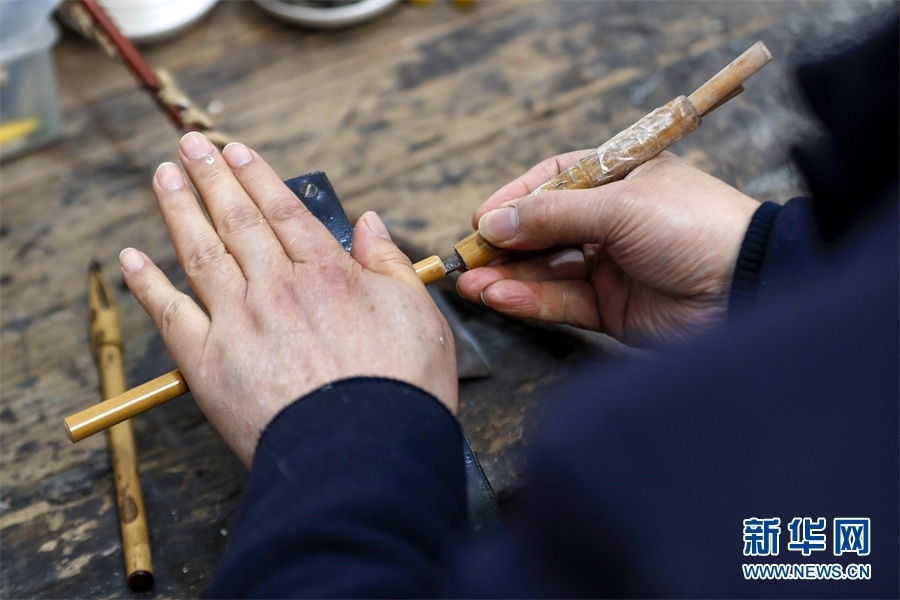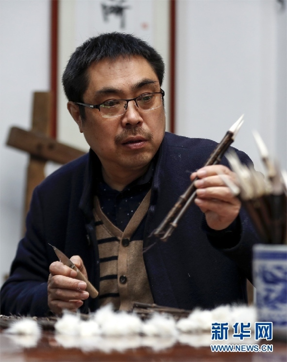 近日,國(guó)家級(jí)非遺傳承人楊文正在制作筆頭。