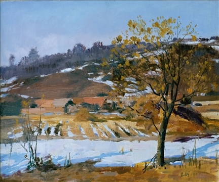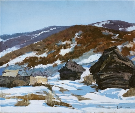 《激戰(zhàn)松骨峰》描繪的是抗美援朝戰(zhàn)爭中,中國人民志愿軍與美軍激烈廝殺的悲壯場面。作者從動態(tài)型的構(gòu)圖與形象表層,把戰(zhàn)爭集團(tuán)之間的搏殺以濃重的筆調(diào)展現(xiàn)開來,表現(xiàn)了中國人民志愿軍英勇頑強(qiáng)、熱愛自由和勇于犧牲的精神,展示了歷史的悲劇性沖突。作者從沉甸甸的歷史中找到戰(zhàn)爭中最慘烈、最殘酷、最能表現(xiàn)人物悲劇性命運(yùn)的瞬間,用現(xiàn)實主義的創(chuàng)作手法,扎實、生動地塑造了一個又一個志愿軍勇士的形象。硝煙籠罩著戰(zhàn)場,鮮血與白雪融合成冰,敵我雙方,犬牙交錯,生死搏殺。同時,也使我們感受到戰(zhàn)爭的殘酷與生命的脆弱。作者處理宏大的戰(zhàn)爭場面獨(dú)具匠心:陽光透過硝煙,有節(jié)奏地營造出戰(zhàn)場的空間;雪地上被間隔的藍(lán)色陰影,反襯出黃褐色的主調(diào)。作品對細(xì)部進(jìn)行了恰如其分的刻畫,但又不失對整體宏觀的把握,厚重的色彩中透出熱情,樸拙的筆觸映著畫家的激動。