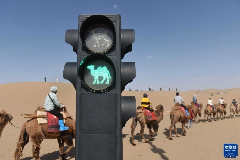 5月11日,在鳴沙山月牙泉景區(qū),游客乘坐的駱駝隊(duì)根據(jù)“駱駝紅綠燈”有序通過(guò)路口。