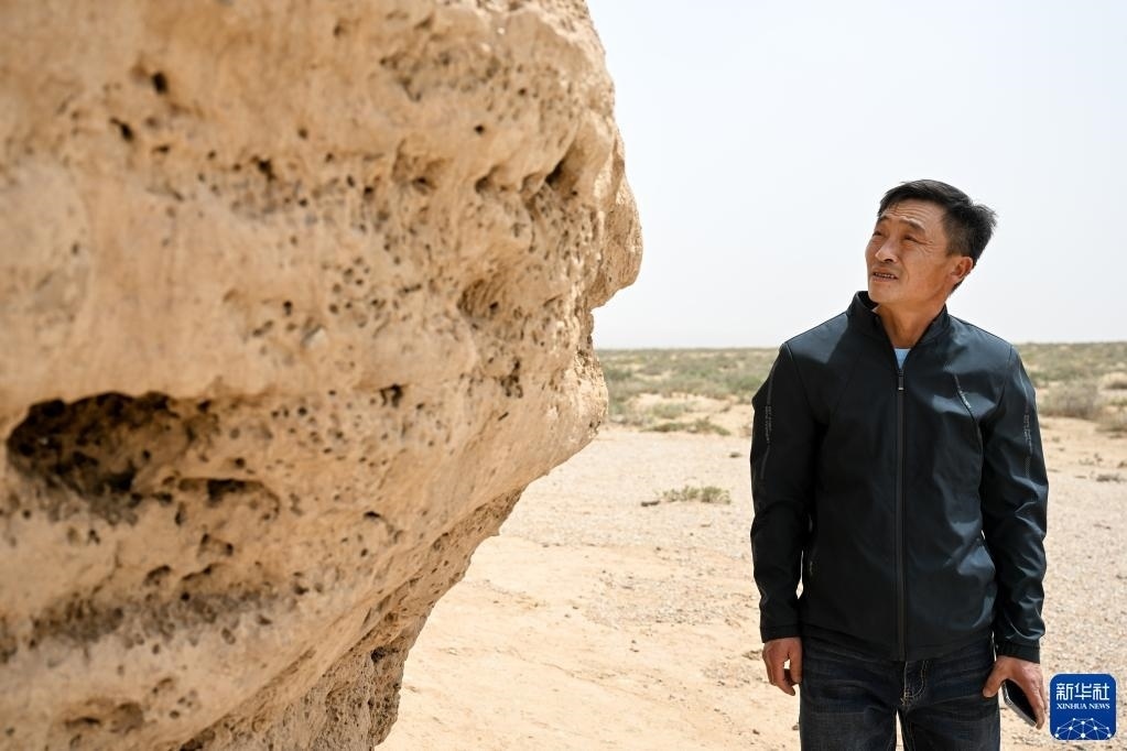 5月13日,駝峰(長城)文物保護(hù)隊(duì)員布音烏力吉在觀察阿拉善左旗一處烽火臺遺址表面,查看是否有人為破壞痕跡。