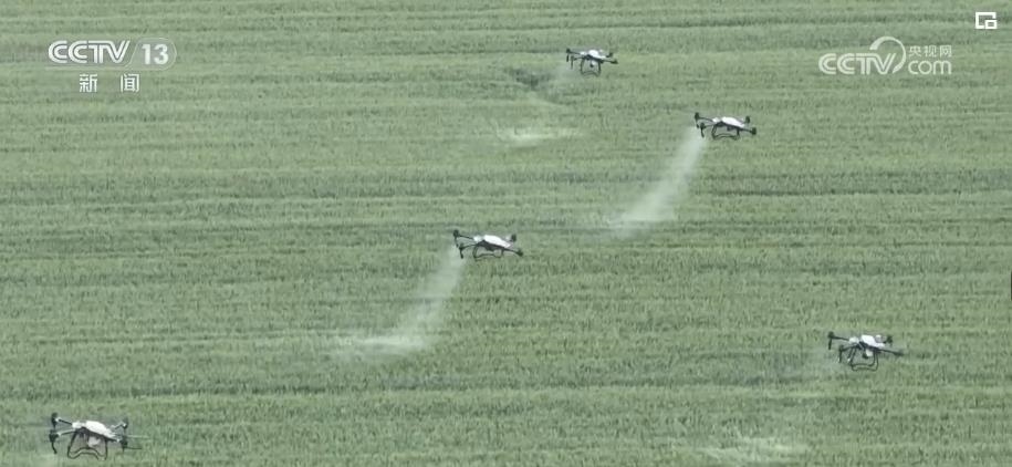 在運(yùn)城河津市的小麥地里,10架無(wú)人機(jī)正在麥田上方進(jìn)行噴灑作業(yè)。