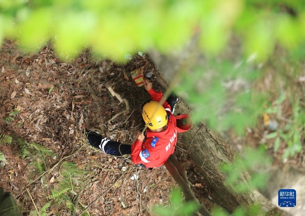 5月14日,張家界市武陵源區(qū)山地應(yīng)急救援隊(duì)隊(duì)員在天子山的絕壁間索降。